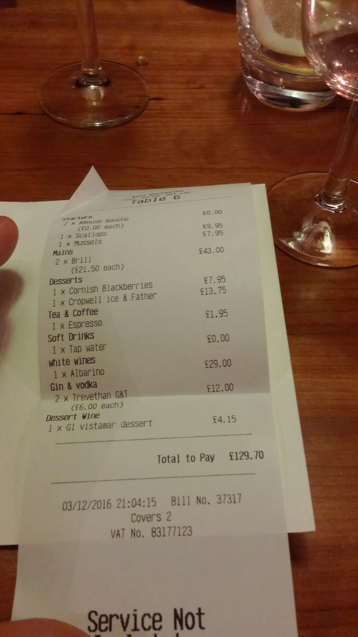 A week in Cornwall coincided with a 13th wedding anniversary for me and Mrs. SF (Mrs. SF said it feels more like 130 years – that is a good thing right?!). We always tend to go out for dinner on our anniversary (me to toast my good fortune at punching well above my weight and Mrs. SF to reflect on her seemingly appalling taste in men whilst tucking in to a plate(s) of good tasting food).
