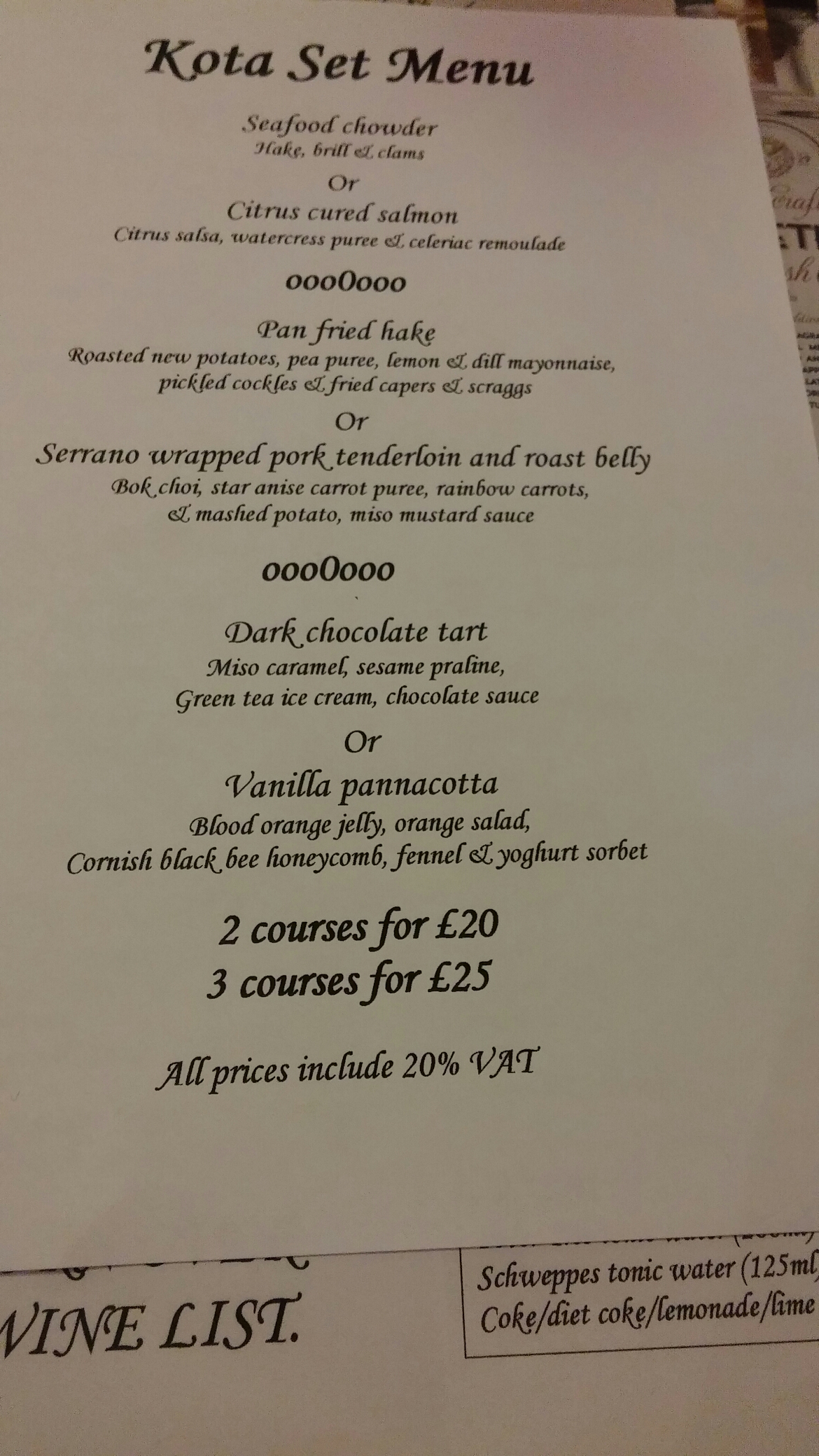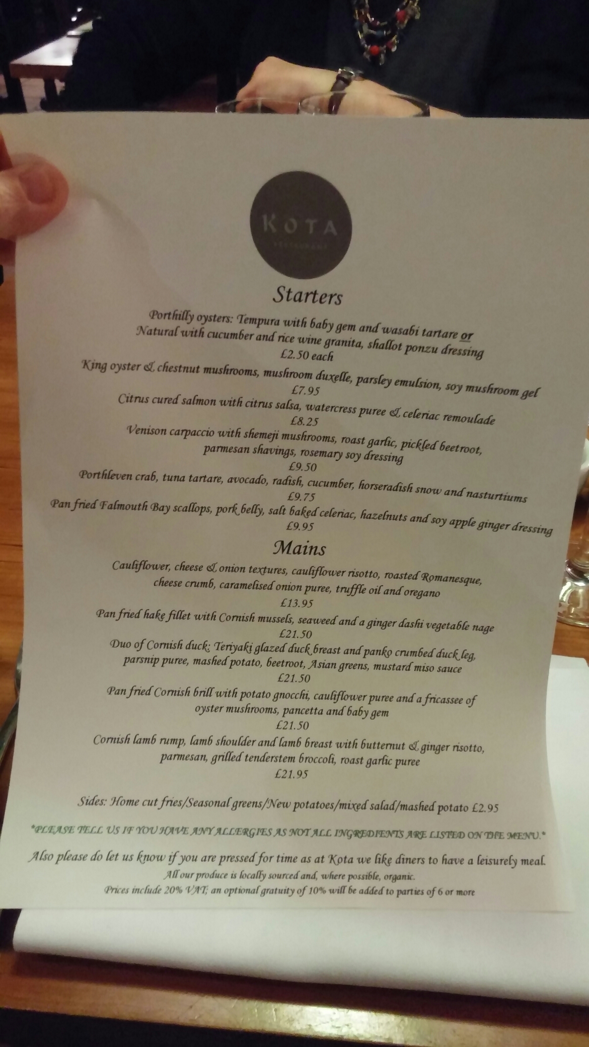 For our anniversary meal our choice was Kota (not doggy friendly), whose chef patron is Jude Kereama – a regular on the Great British Menu ( having battled it out this year with Josh Eggleton of the Pony and Trap and Chris Wheeler of Humphry’s). On previous visits to Porthleven we have always eaten there and enjoyed the food and saw no reason to choose Rick Stein’s new gaff in Porthleven (which gets somewhat mixed reviews – Porthleven seems to have accepted the Stein juggernaut with the merest shrug of the shoulders and as yet there is no question of it turning into LevenStein/PorthStein) over Kota for our anniversary meal.