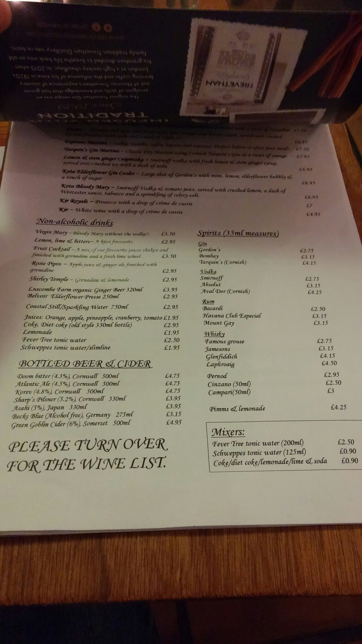 For non wine drinks they have a selection of cocktails, spirits and beers (all with at least a nod to Cornish products) and it is always nice to see a decent selection of soft drinks for the designated drivers.