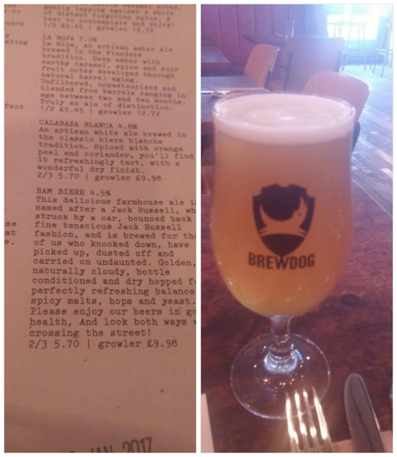 It would have been churlish not to have at least one beer when dining in a beer orientated place like BrewDog and a number called “Bam Biere” tickled my fancy with a rather lovely dog related back story. A very nice, refreshing, beer which lived up admirably to the promising description the blurb gave it.