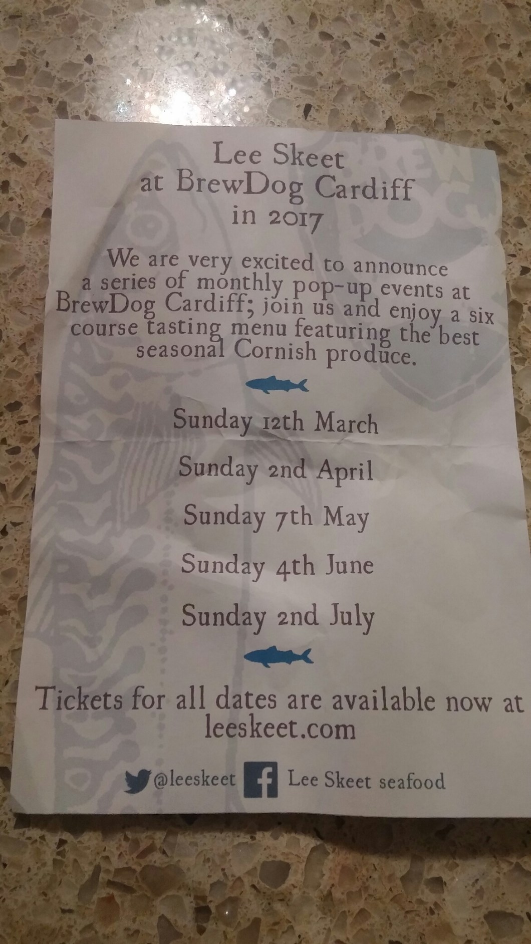 Clearly a hugely talented chef, so when I heard he was doing a pop up at BrewDogs in Cardiff (a follow up to the sell out event held by him there last year) I bought tickets for Mrs.SF and I immediately (without even seeing the menu). Not something I wanted to miss (with only 2 rolling sittings, which sold out very quickly).