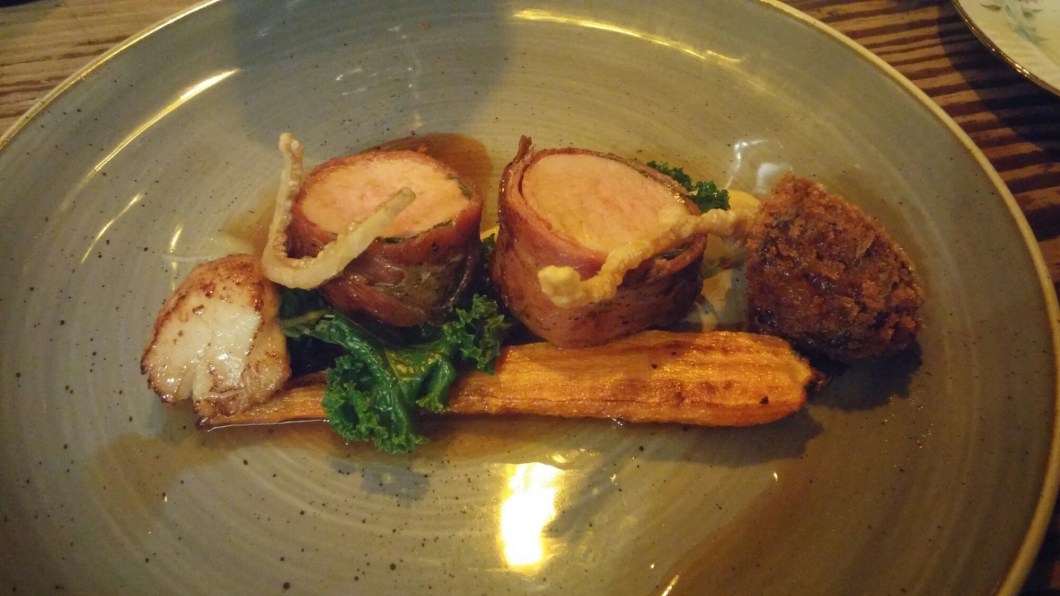 The pork dish (I had this) consisted of two nicely cooked pieces of pork loin wrapped in sage and Parma ham (saltimbocca-esque). Pork loin is easy to overcook and can really dry out if not treated with due care, but here it was bang on the money. The pork cheek element was done as a deep-fried fritter, with a nicely crisp outer shell encasing lovely tender, slow cooked, cheek. The accompanying vegetables, in the form of iron rich kale and a sweet glazed carrot, worked well with the pork. The potatoes in the pan (a variety of new potatoes in a cast iron skillet) were OK, but I would have preferred them a bit crisper (they came out as just slightly dry new potatoes)