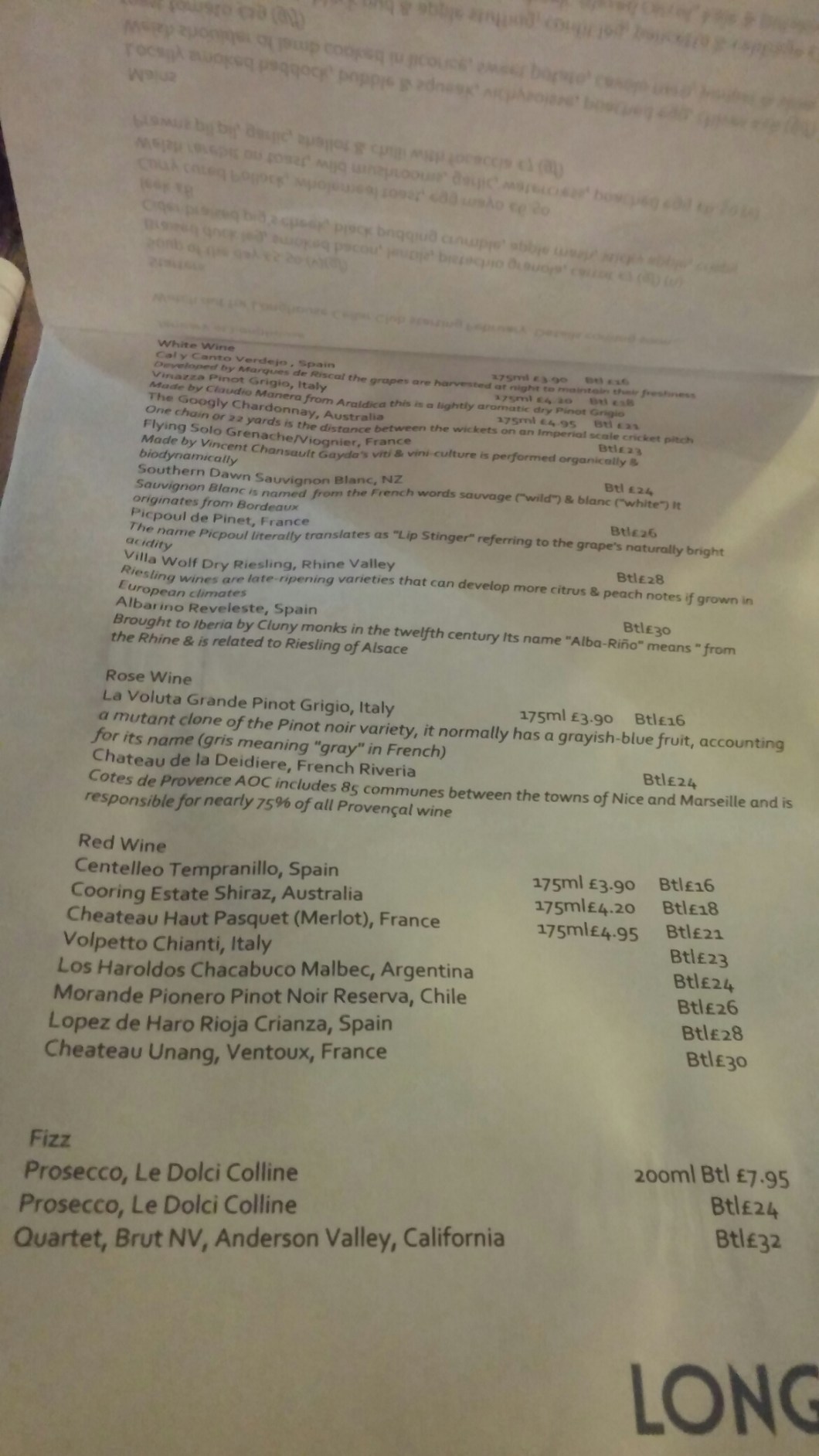 Bar from the lack of knowledge re drinks, services was good. Our bill was, however, way off (£196.90 as against the £161.45 it should have been). A large number of unordered “additional” drinks were on it – the wine we ordered was OK, but we certainly weren’t going to pay for it twice.