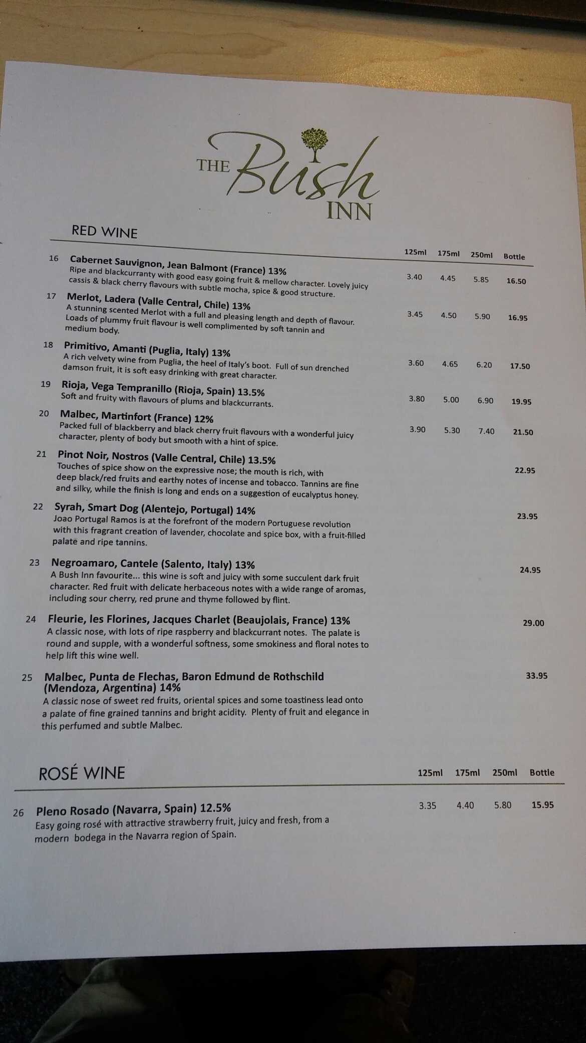 I think the Smart Dog syrah (rather apt for a doggy friendly pub) on the list (from the somewhat underrated and under represented, in the UK, Alentejo region of Portugal ) would have worked quite well with my rabbit pie. Not too hideous a mark up with it being priced here at £23.95 as against a retail price of about a tenner (seen a hell of a lot worse mark up recently). Mark ups elsewhere can be a touch higher, with the Punta de Flechas Malbec being £33.95 (whereas I can get it retail for £13.95).