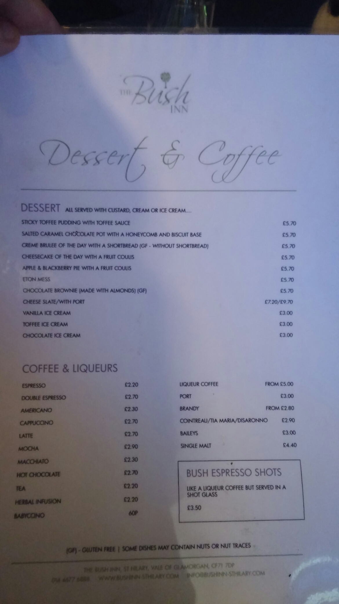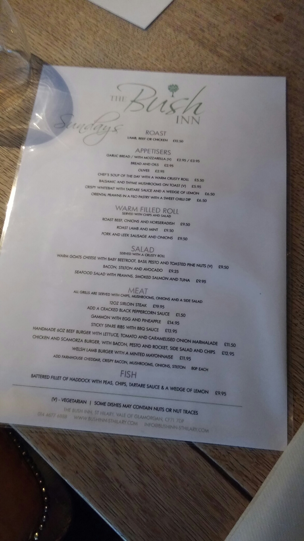 I choose the Bush Inn at St. Hilary as the venue for lunch as it is about half way between Cardiff and our chosen walk on Newton Beach, offers food quite late into the afternoon (until 16.00 on a Sunday) and most importantly (said walk on the beach was to exercise our respective dogs and to blow away the cobwebs after a rather late and drunken night) is resolutely dog friendly. It also has a rather fine sounding selection of pies on its menu according to its website.