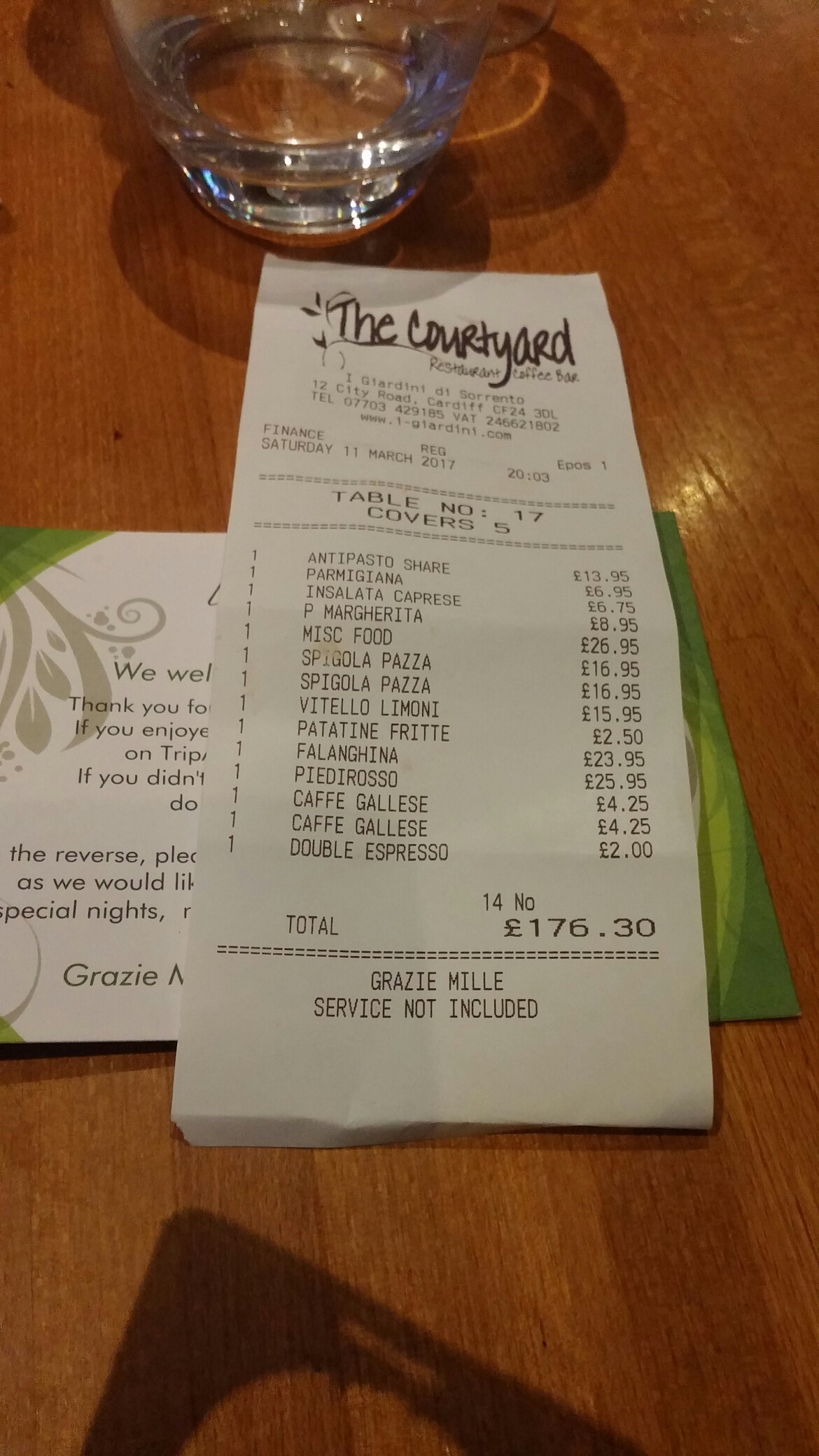 The damage for 6 of us with a fair amount of booze was just over £176 (without a tip – which was given as service was very good).