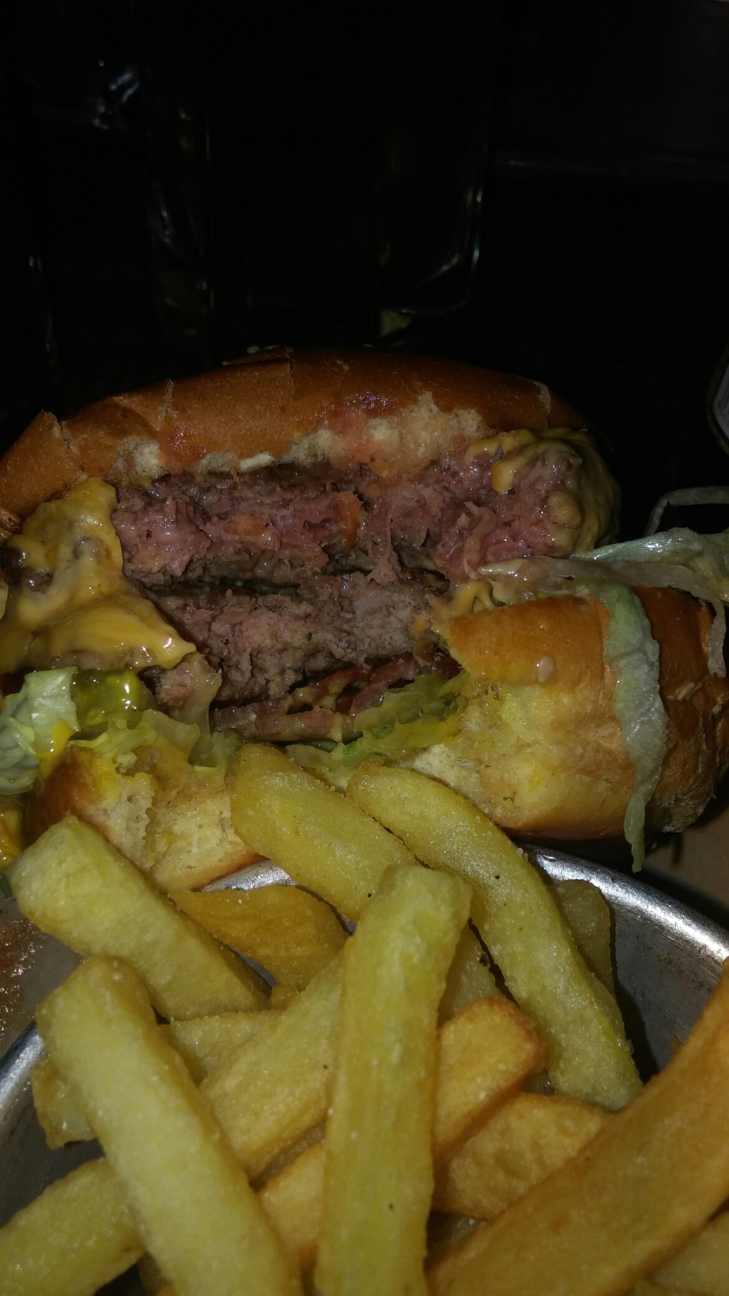 To this I added (for an extra £2) candied bacon. I didn’t stipulate a preference as to the cooking of my burger and it was gratifying to see the top patty coming in the right side of medium rare. The bottom one was a bit more well done than I would have liked