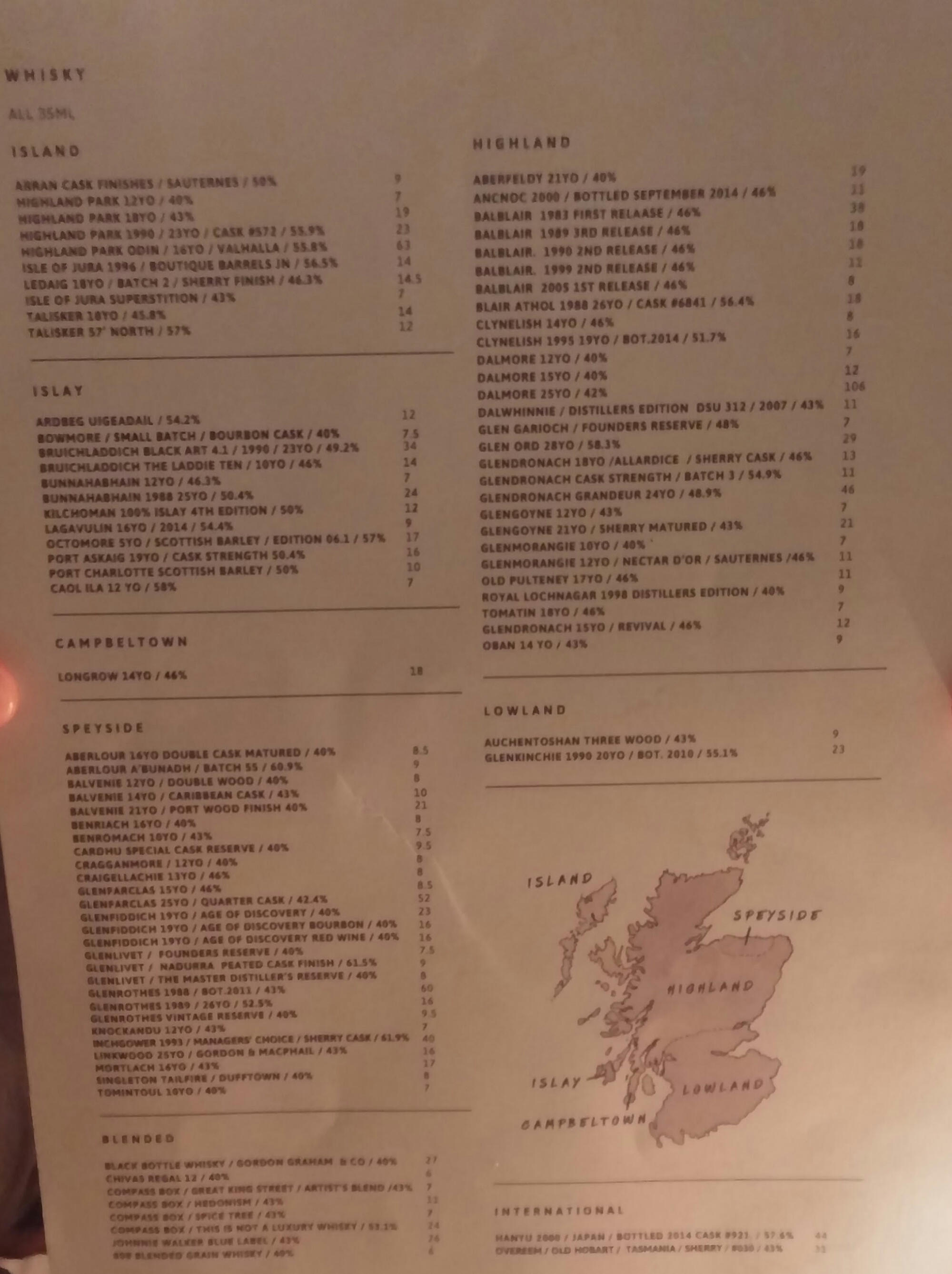 and suggestions (on the main food menu) as to whisky pairings with dishes on offer ( an “Auchentoshan 3 wood” is recommended with the veni-moo for instance).