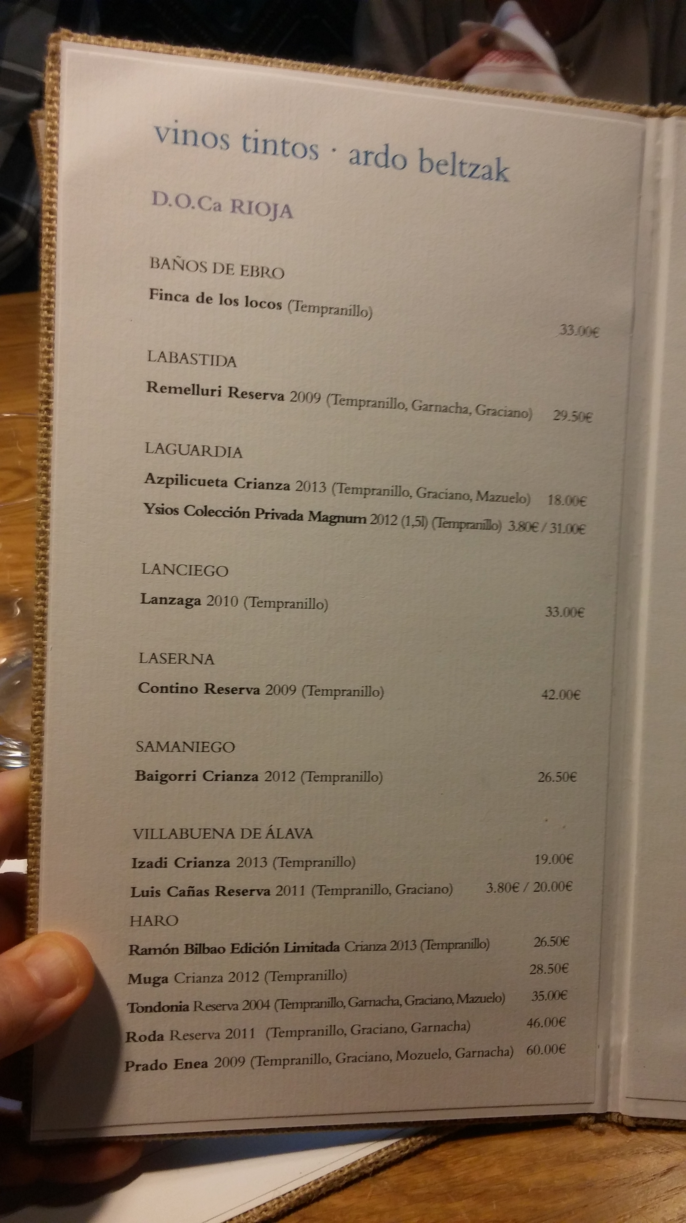 Putting the prices here in context, the Muga Prada Enea goes for £110 a bottle in Benares in London (€60 on the list here and Muga is always pricey compared to other Riojas on lists in Spain – retail prices here for it are similar to those in UK ) and the Vina Tondonia is £65 in Asador 44 in Cardiff (on the list here at €35)