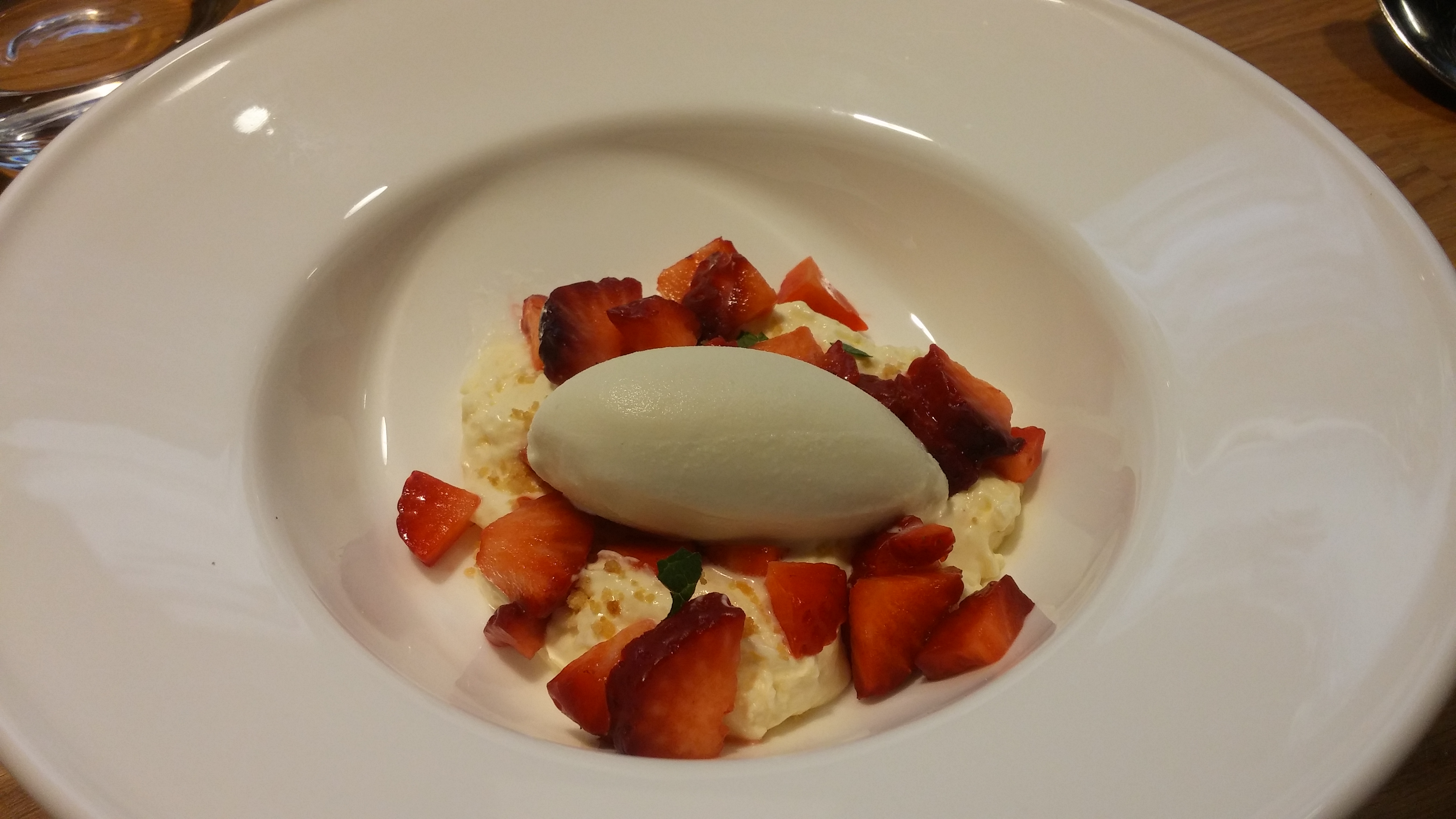 Finally we had a strawberries and cream number. Good properly flavoured (rather than tasteless rubbish) strawberries, a pleasant mascarpone cream, studded with a subtle liquorice flavoured crumb, made for a pleasant last proper course.