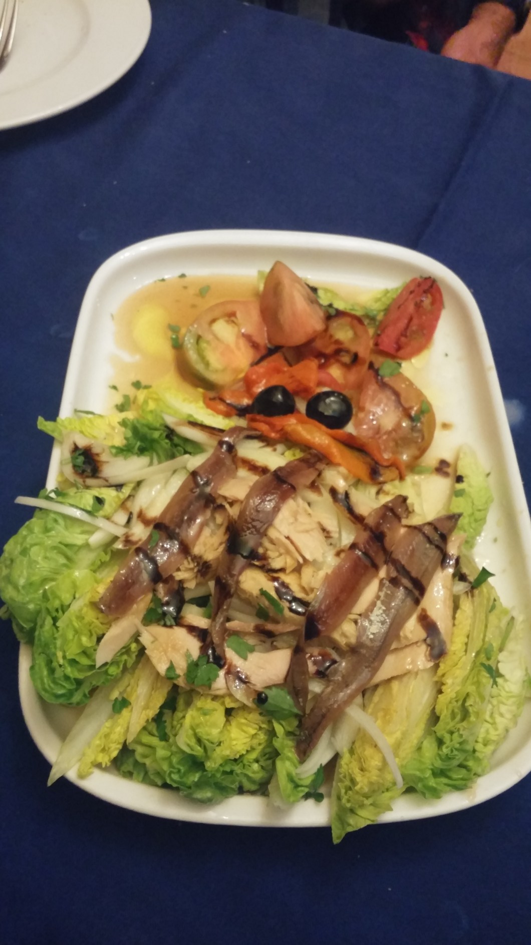 A massive amount of romaine lettuce was topped with a very decent amount of quality canned tuna and salted Cantabrian anchovies. To this was added some lovely (really tasty) tomatoes, peppers, olives and sweet Spanish onions. It had a liberal coating of a rather good dressing.