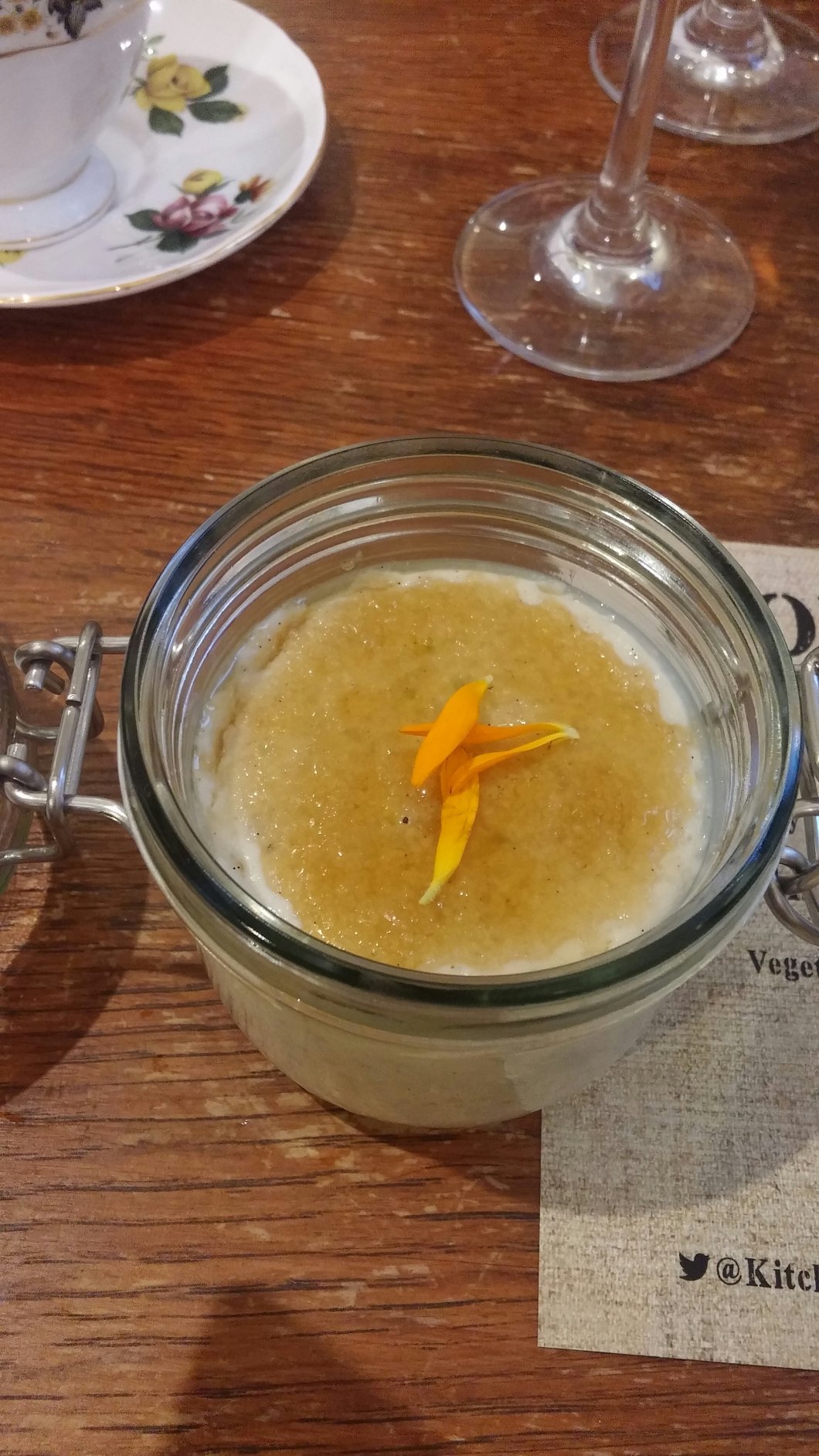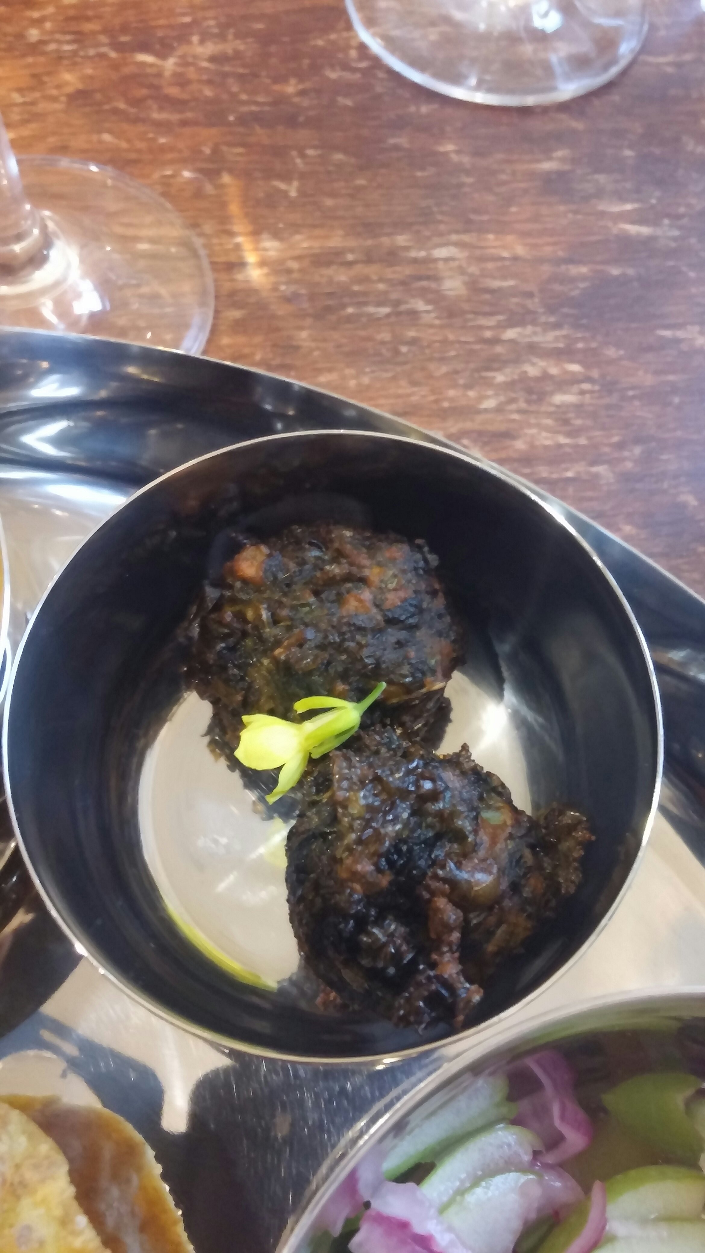 My only criticisms of this (and of the whole night really) was the sugar remained crystallised on the top rather than having properly melted and reformed as a sheet as you get with a brulee (bit more blowtorch time required) and the somewhat odd addition of what transpired (after I had eaten it) to be a chive flower (thought it looks like one when saw it, but then thought nah can’t be as I popped it into my gob). The latter was missing from my kheer, perhaps it was meant as a garnish only, but I ate the one Mrs. SF had with her kheer (and I was not the only one to do so). What those of us foolish enough to eat it got was a bit of an unwelcome oniony flavour with our kheer. Perhaps skip it next time or tell people it is not to be eaten (my view on garnishes, in general, is if it is not for eating it shouldn’t be there).