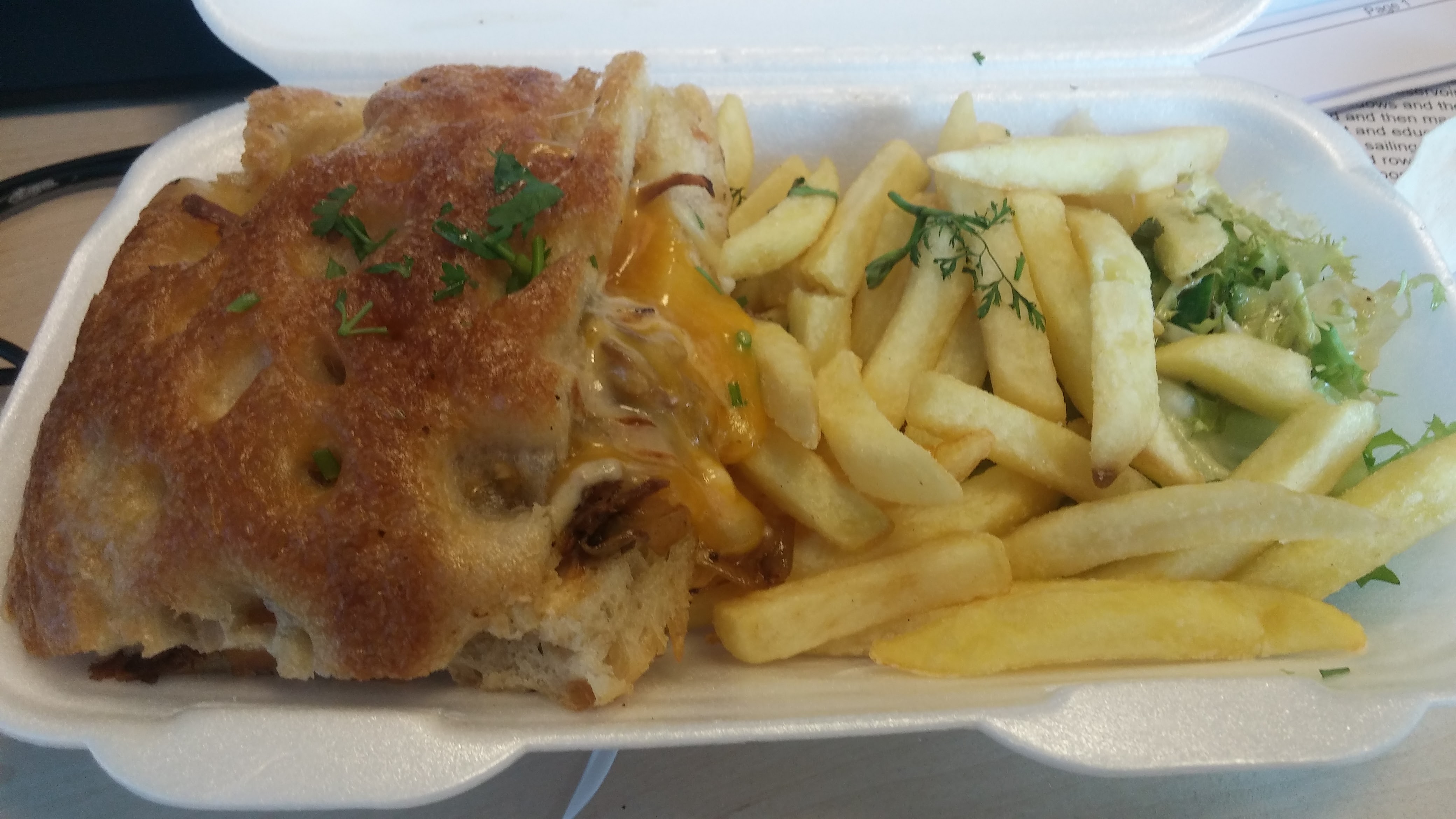 It came in a nice (almost focaccia style) roll, with the beef smothered in a nice bbq sauce and then topped off with a gooey cheese sauce. Sides were a nicely dressed green salad (love fact they had bothered to properly dress it, as undressed salad is rabbit food) and some chips. The latter were plentiful and nicely seasoned, but needed just a tad more fryer time to get them properly crispy.