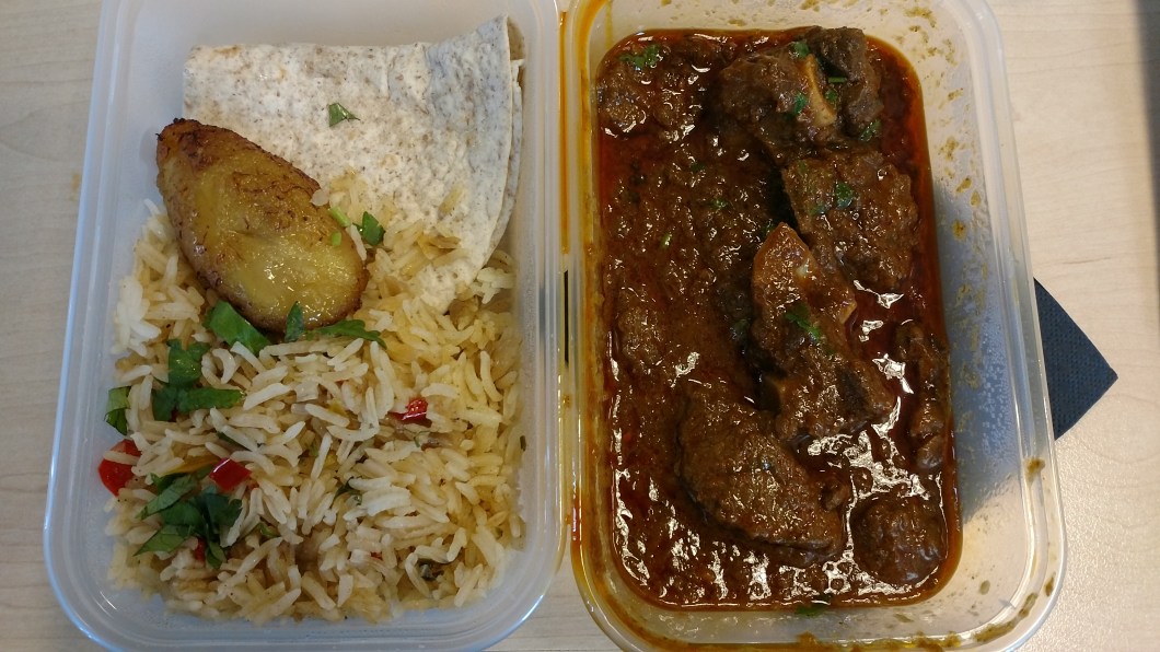 The rice was well cooked and was laced with a nice mix of stuff. Bit of heat from some chilli and some crunch from spring onions, as well as the freshness of a decent amount of chopped coriander. The tortilla was fairly regulation, but a nice enough vehicle for mopping up the remnants of the curry. The final component was a rather pleasing chunk of plantain. I have always liked the starchiness of plantain (needs to be cooked for long enough, as is dreadful if undercooked – it was just right) and here it had a touch of caramelised sweetness to it that worked well with the chilli in the curry and rice. A nice dish, I though, and very good value for £5.