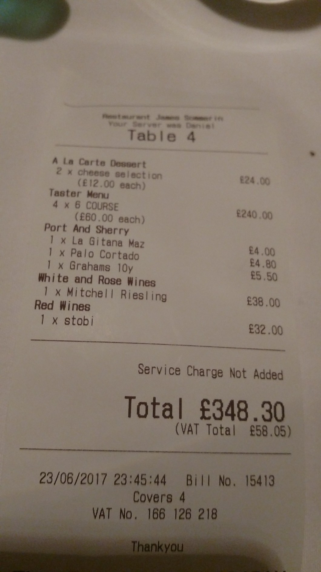We paid (less a tip – service, sherrygate and wine not being left on the table aside, was good) just shy of £350 for four with a reasonable amount of booze.