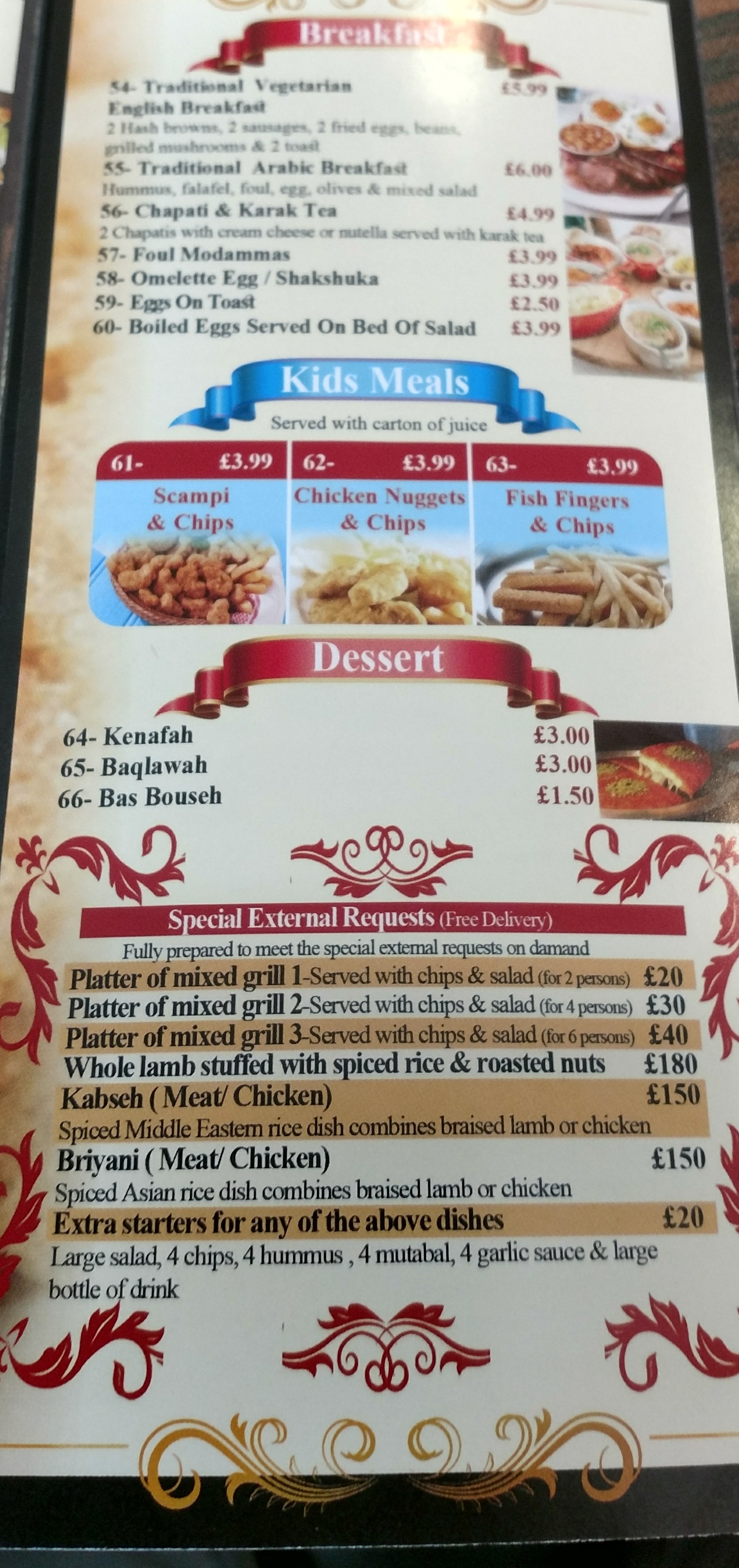Their breakfast offering also appeals (bar from the sop to a full English with veggie sausage and no bacon – the place is, as you would expect, resolutely halal) with shakshuka and what looks like an interesting traditional Arabic breakfast number including the unfortunately named foul (despite the name I have enjoy this, broad bean number, on divings trip to the Red Sea).