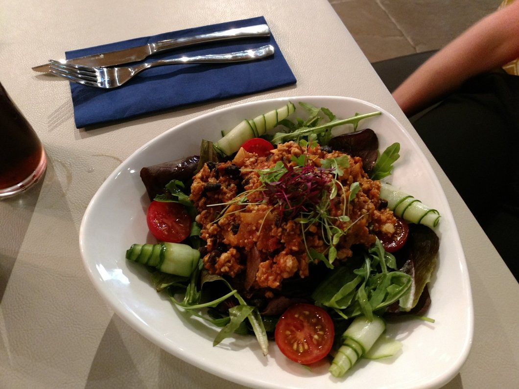 Good sized portion again (especially for the £5.45 price tag – seemed to me strange that it was so much cheaper than the burger), with a nicely cooked sweet potato and a generous amount of both the chilli and side salad. The only downsides were the turkey mince chilli was a bit tame (more like a UK style Bolognese) and, one of my bête noires, no dressing on the salad. Seems odd to me that the kitchen went to the trouble of making pretty cucumber curls, but then didn’t dress the salad.