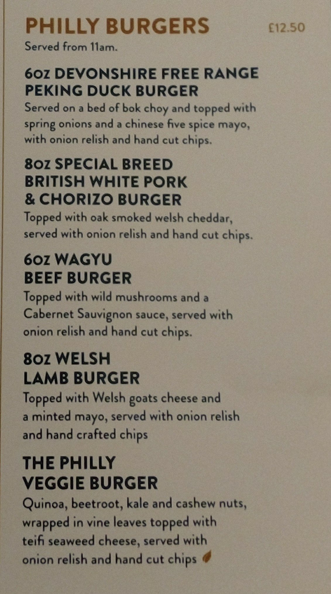 At lunch time, the market is fiercely competitive in Cardiff and if I was looking at spending £10 plus I would probably choose Bar 44 (3 tapas – £11), Asador 44 (£10 – one main course), the Classroom ( 2 courses – £10.50) or the Potted Pig (2 courses for £12, which includes currently a main of a Welsh lamb burger and fries) over the Philly.