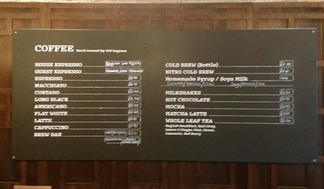 Prices for the coffees range from £1.90 (for an espresso) to £3.20 (for the brewbar – a very interesting sounding V60/aeropress Guatamalan Waykan coffee at the time of my visit).