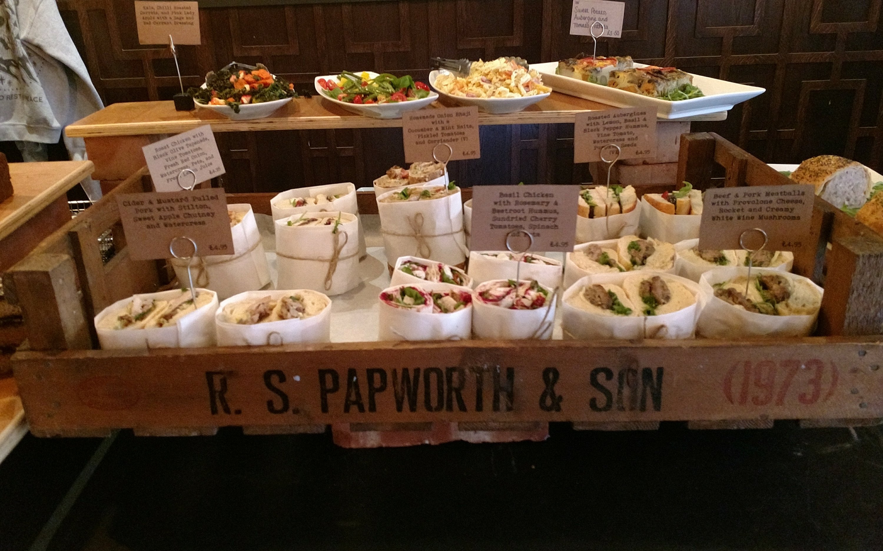 The food is predominately (hot – more warmed up really) sandwich based (a little pricey at £4.95 across the board), with far from your standard fillings. On top of this are a few added extras like sausage rolls, salads and frittatas.