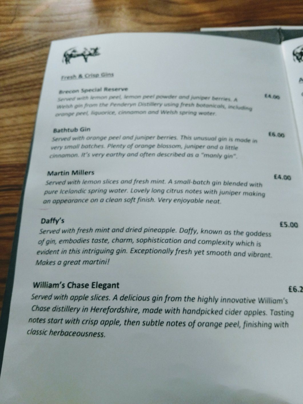 Decent enough drinks selection on the booze front. Lots of gins (a speciality of the place)