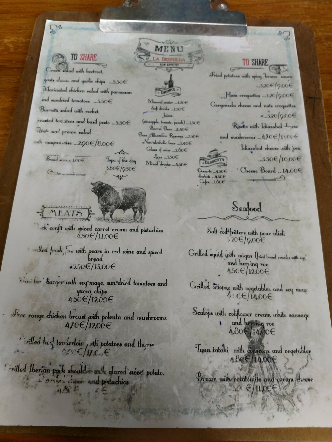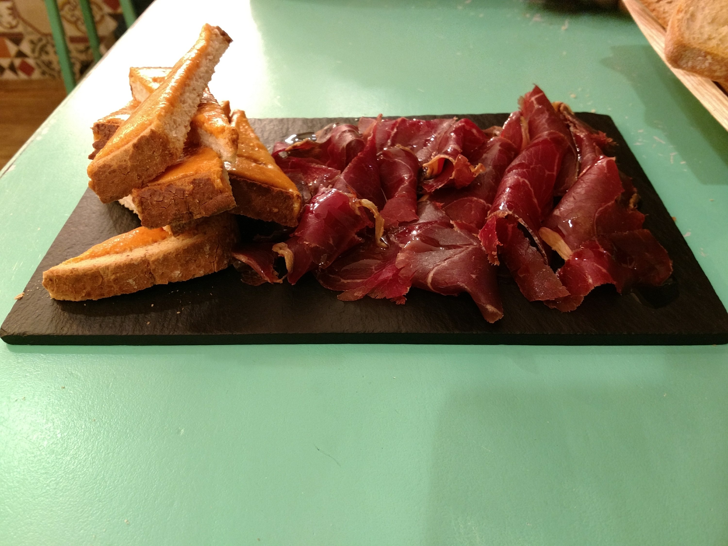 Great cured meats and cheeses (we had some top notch cecina with salmorejo on toast – a good portion for a mere €5 – . shame about the slate, but heyho)