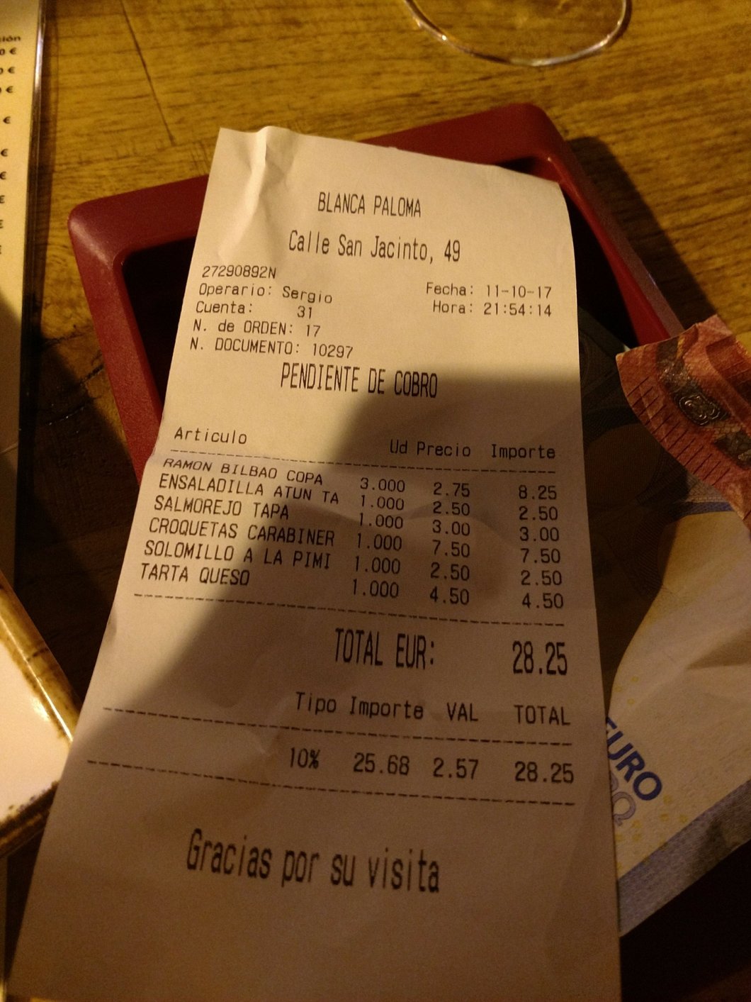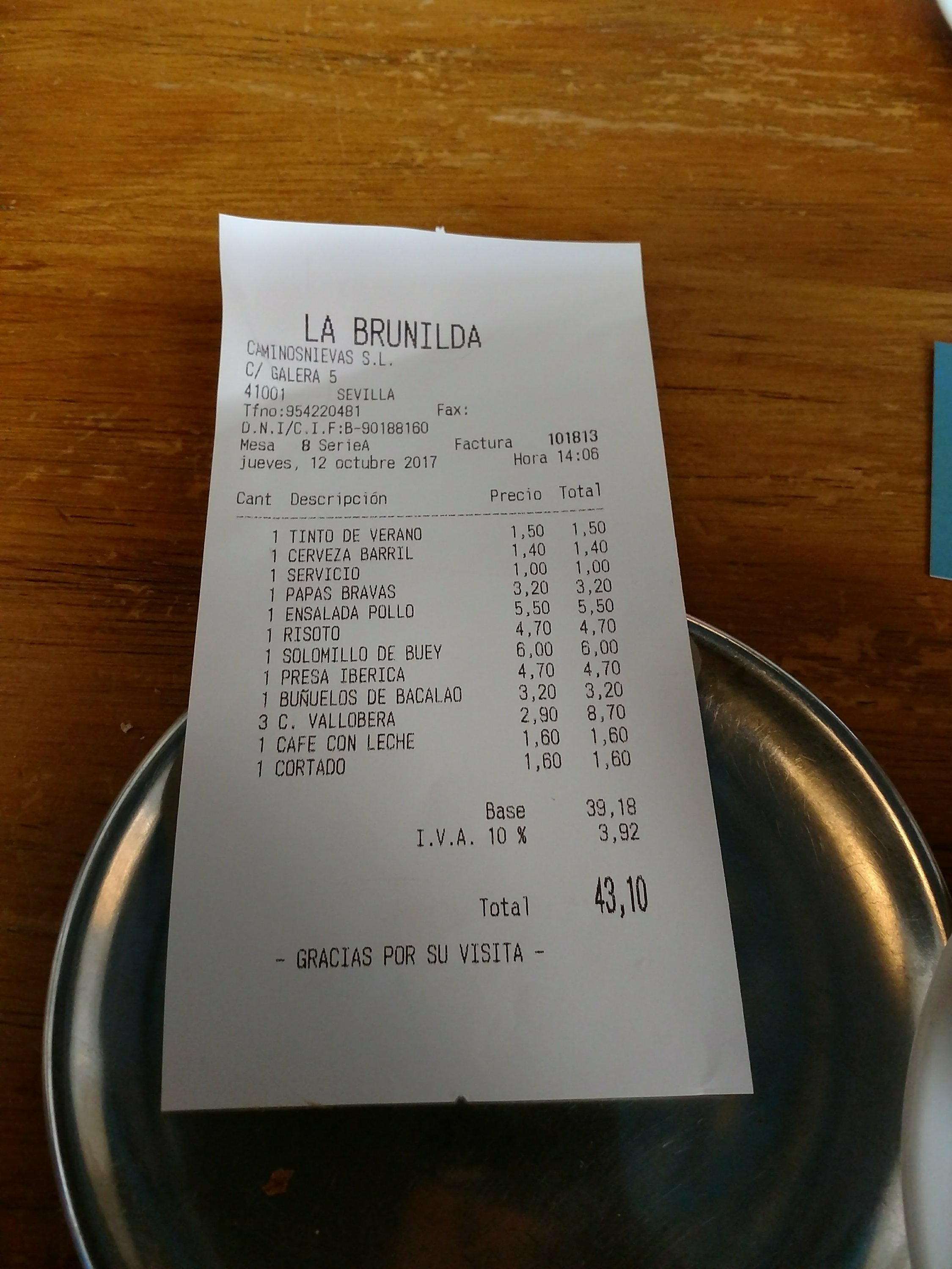 We had, with our food, a few glasses of Ramon Bilbao rioja (€2.75 for a generous pour).