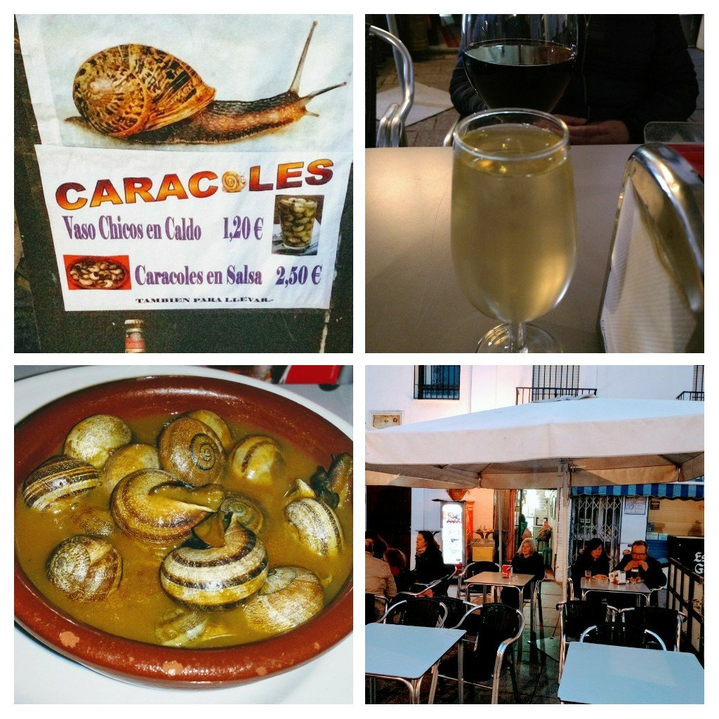 Very cheap with a good glass of fino and a glass of snails in a spicy broth or a larger en salsa portion (which I had) setting you back €2.50/€3,70 (compare that to Chez Francis here in Cardiff where 6 escargot cost £6.95 on my last visit).