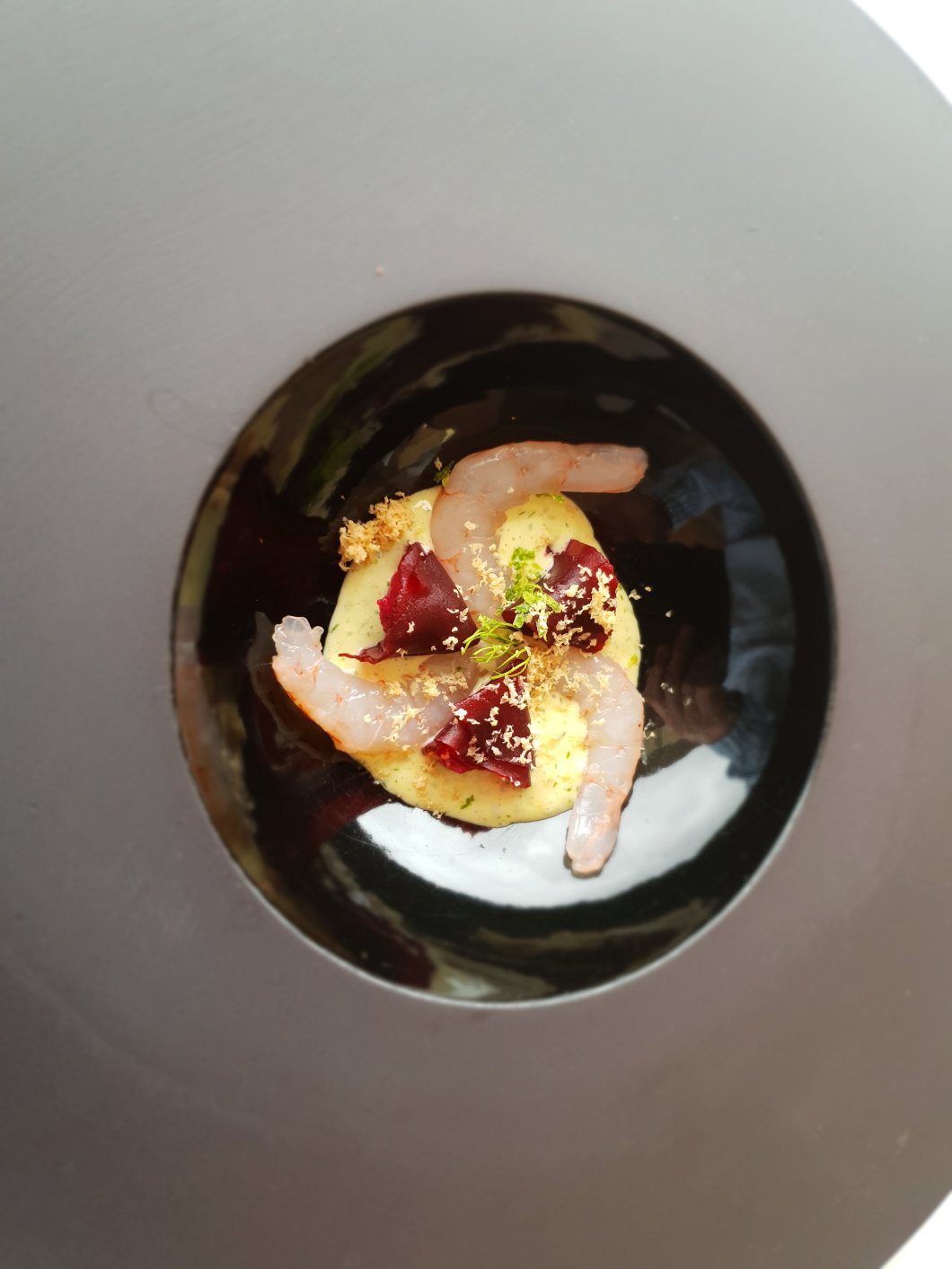 Course 1 – Salted prawns with a dill cream