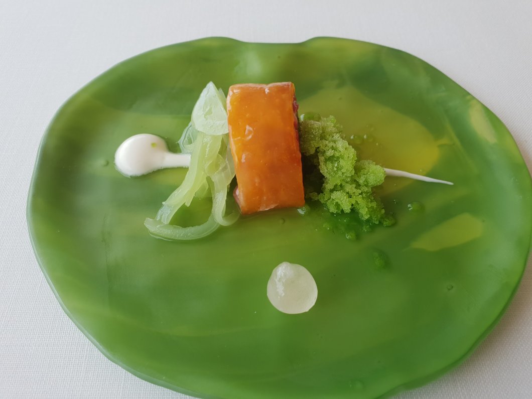 A melt in the mouth fish ball affair, a seaweed cracker avocado sandwich, a bao (spicy chicken) and local salad leaves (very nice, but salad leaves and a lone chilli struck me as an odd things to have as an amuse bouche) were interesting without wowing in my view. The fish ball affair was probably the pick of the bunch.