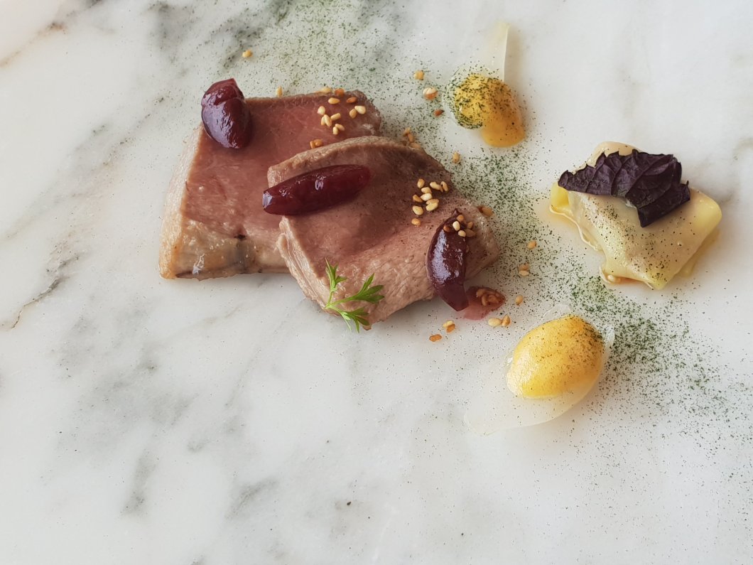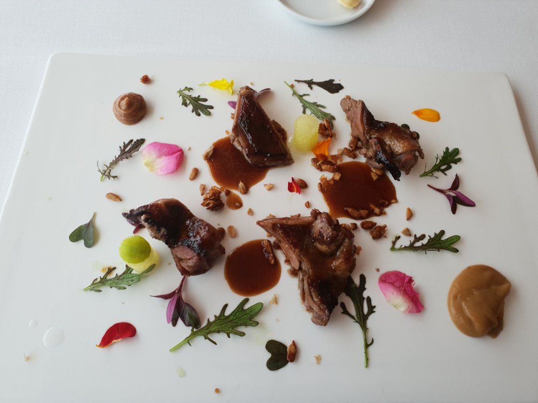 Intriguingly it was predominately made from pinot noir (a grape rarely seen in Spain, with the local hondarribi bektza red grape also in the mix) and I surmised it should be an ideal pairing for the low temperature duck dish.