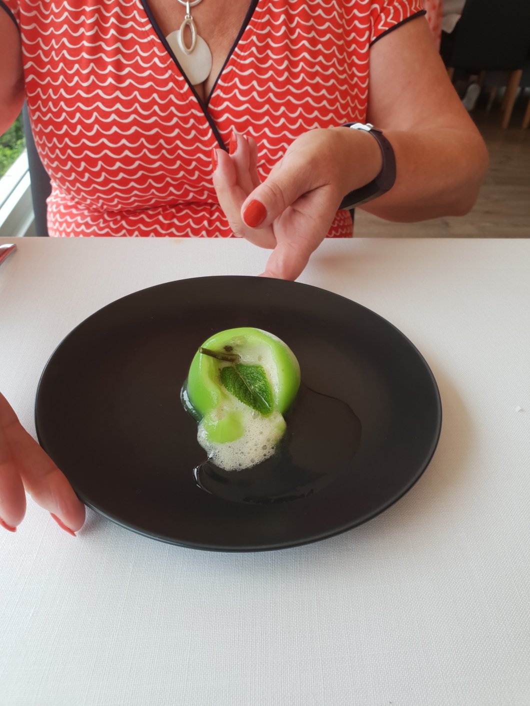 At the table a warm cider concoction (they are very big on cider in the Basque Country) was poured on the rather pretty “apple” causing the green outer shell/skin to melt away and exposure the inner apple sorbet.