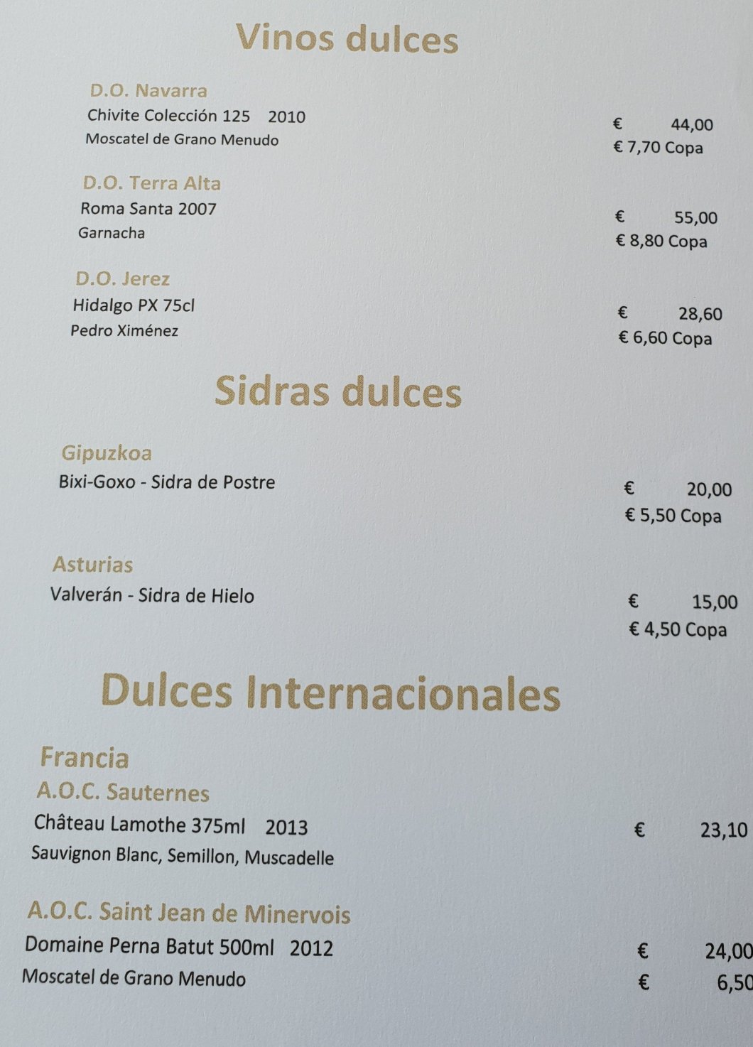 With the dessert, I was intrigued by the presence on the list of sweet wines of a dessert cider and an iced cider (most of Northern Spain, including the Basques, is very big on cider), with the former from Pais Basco and latter from Asturias.