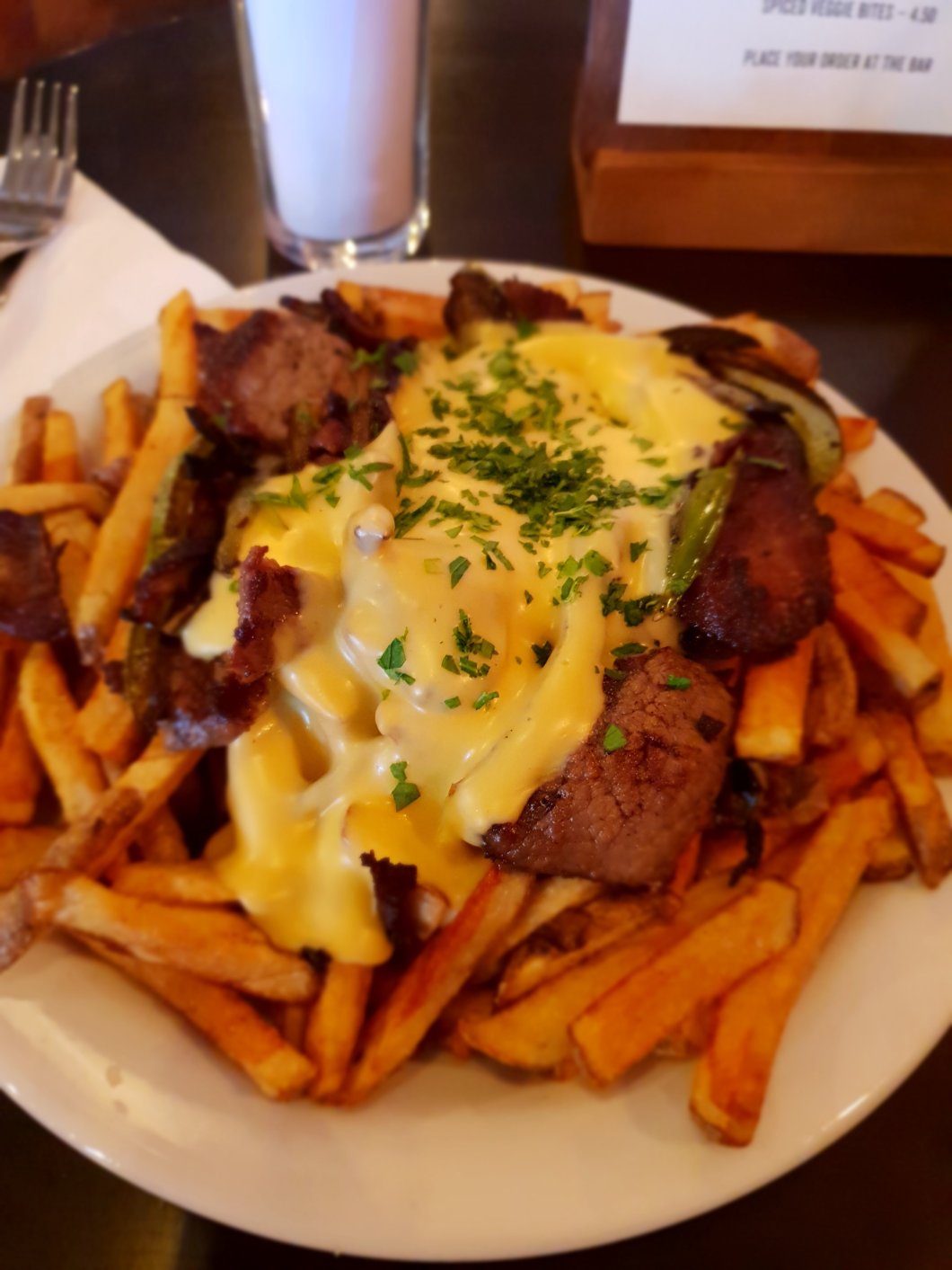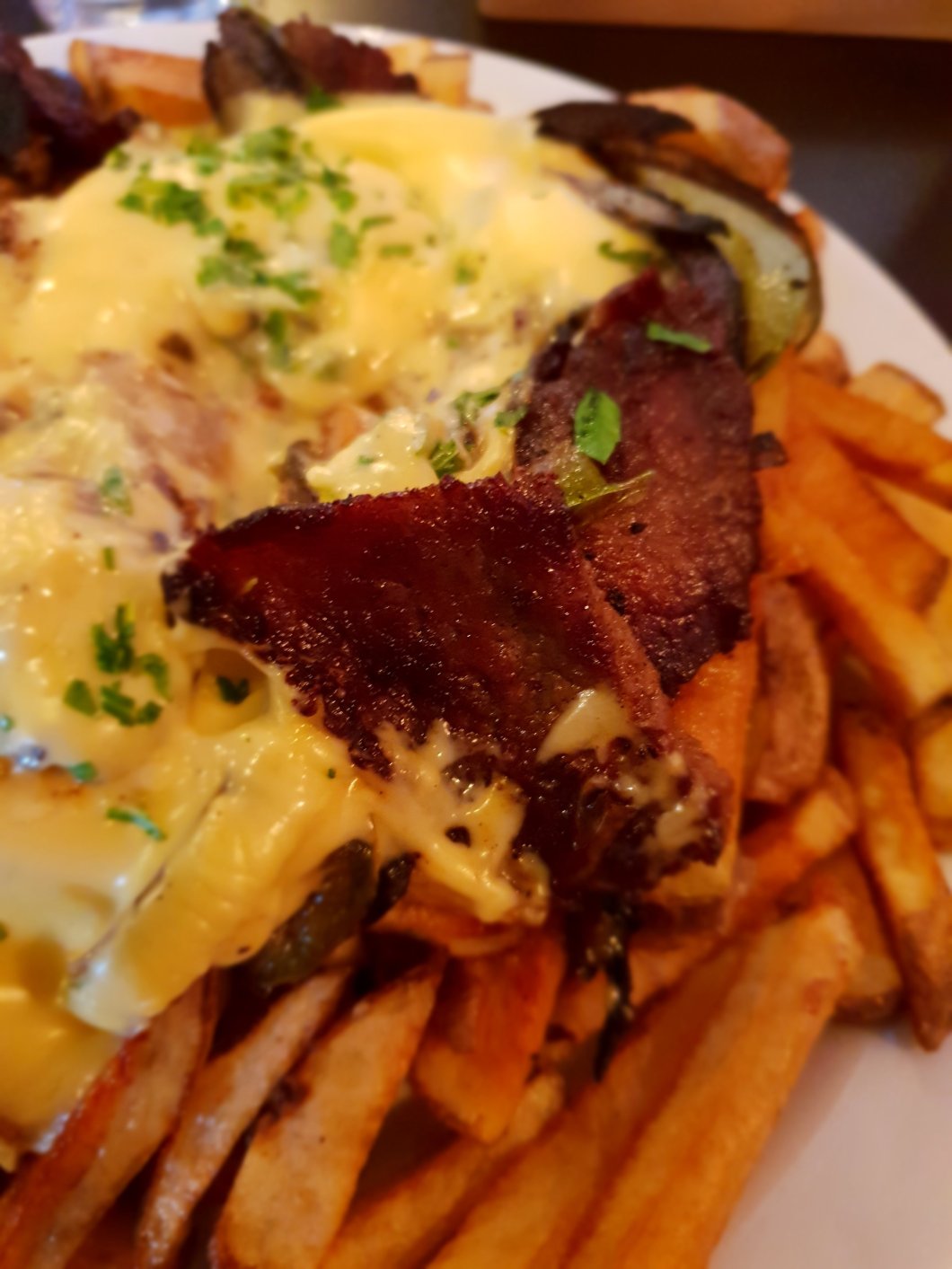 A mound of sliced steak, with caramelised onions and peppers, was covered in a thick yet runny cheese sauce. This, in turn, all sat on a massive pile of fries.