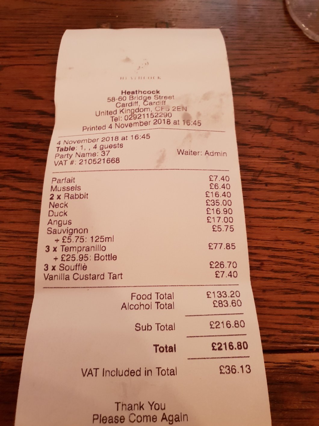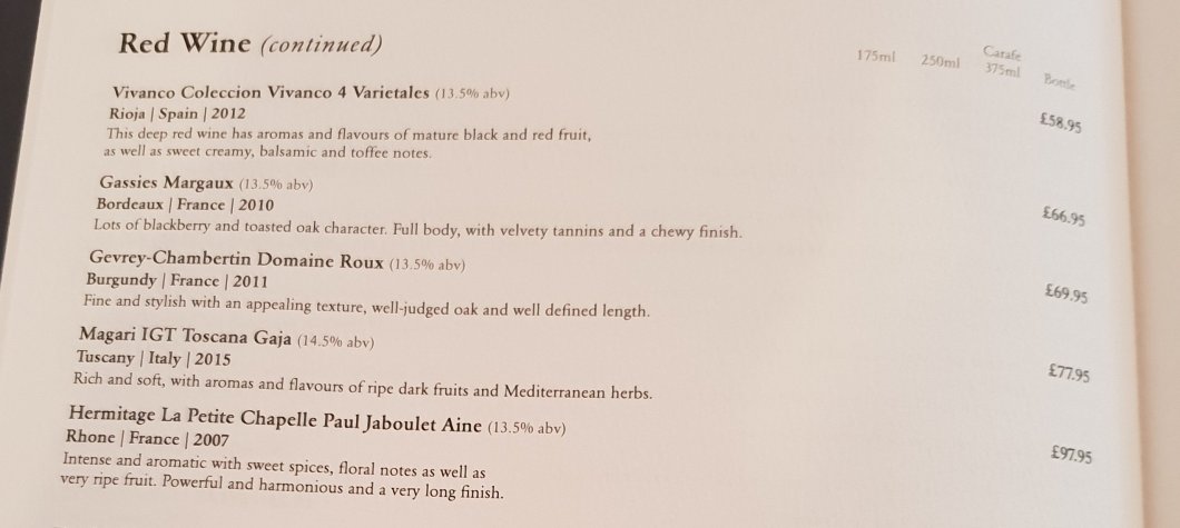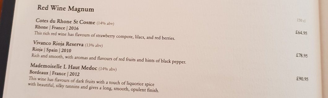 I think it is good value for the quality and quantity of what you get (we didn’t have 3 bottle of the red – with 3, rather than the 2 bottles we had, on the bill due to a mix up and it was sorted out to everybody’s satisfaction simply and without the need to reissue the bill).