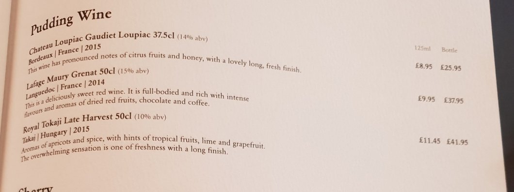 I am afraid the pricing is simple too much and puts me (and any sensible sherry drinker) off in terms of ordering these wines from the list (which is a crying shame). Personally, as a sherry drinker, I think these prices should be rethought as should the pours. Give me a decent pour at a reasonable price and I will finish that bottle off pronto.