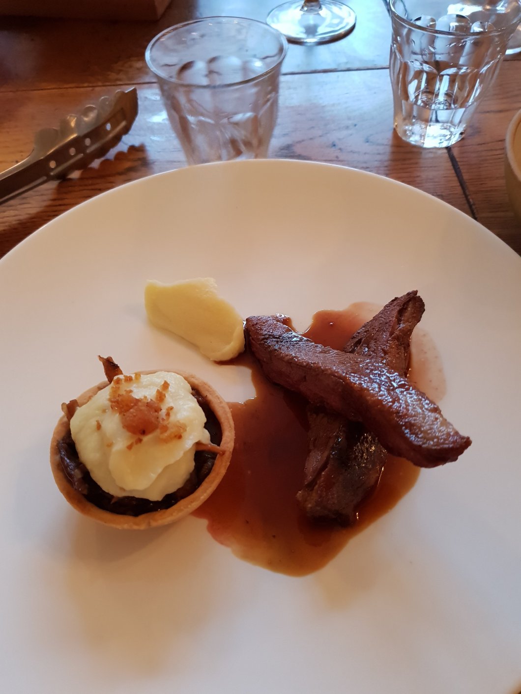 The chicken liver parfait eater went for a bit of game in the form of wild duck (mallard – £16), which came with a delightfully crisp pastry case tart filled with braised duck leg and topped with celeriac puree.