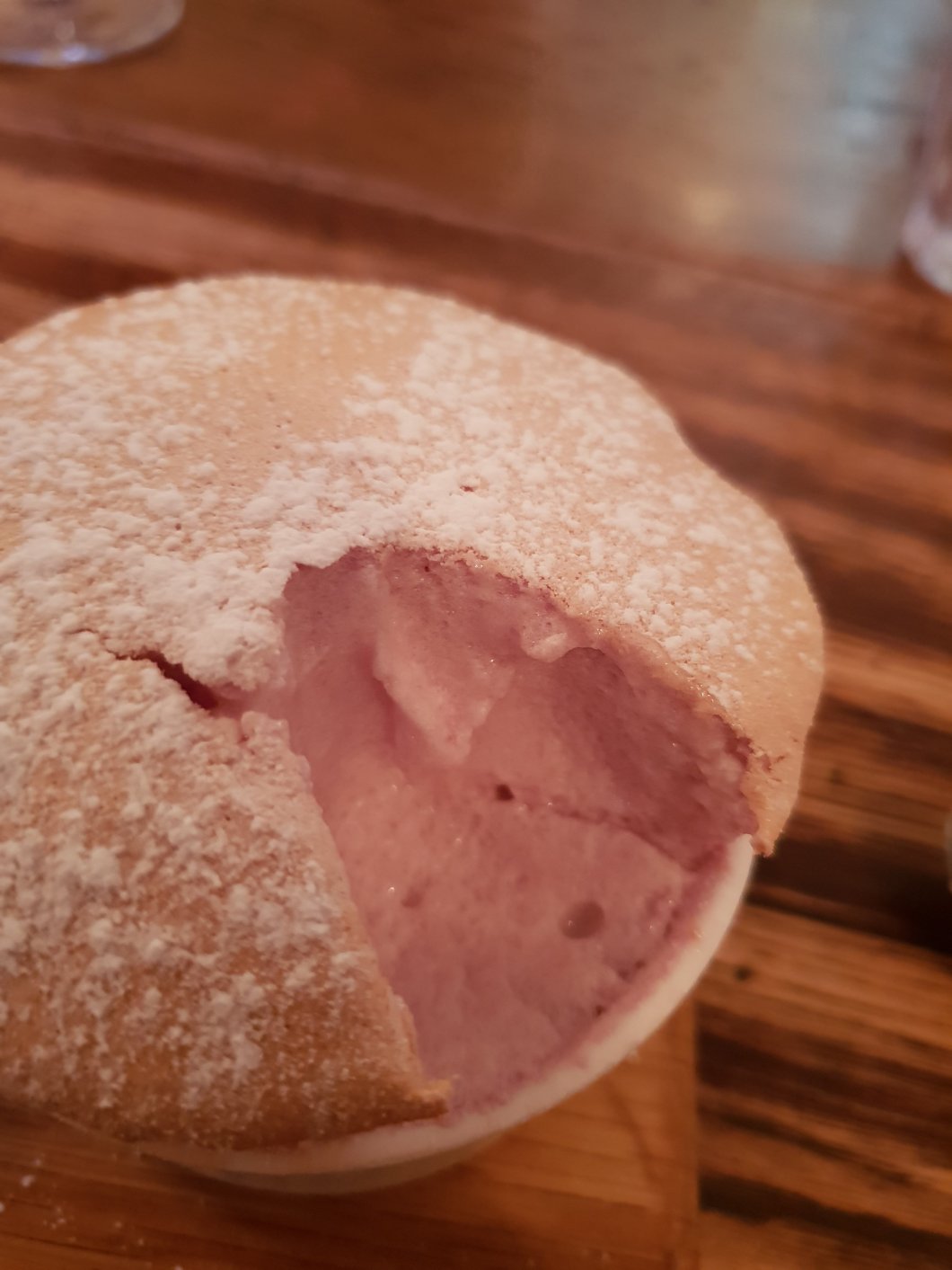 The souffle had risen beautifully, rising proudly above the ramakin lip, with a slightly crisp chewy top.