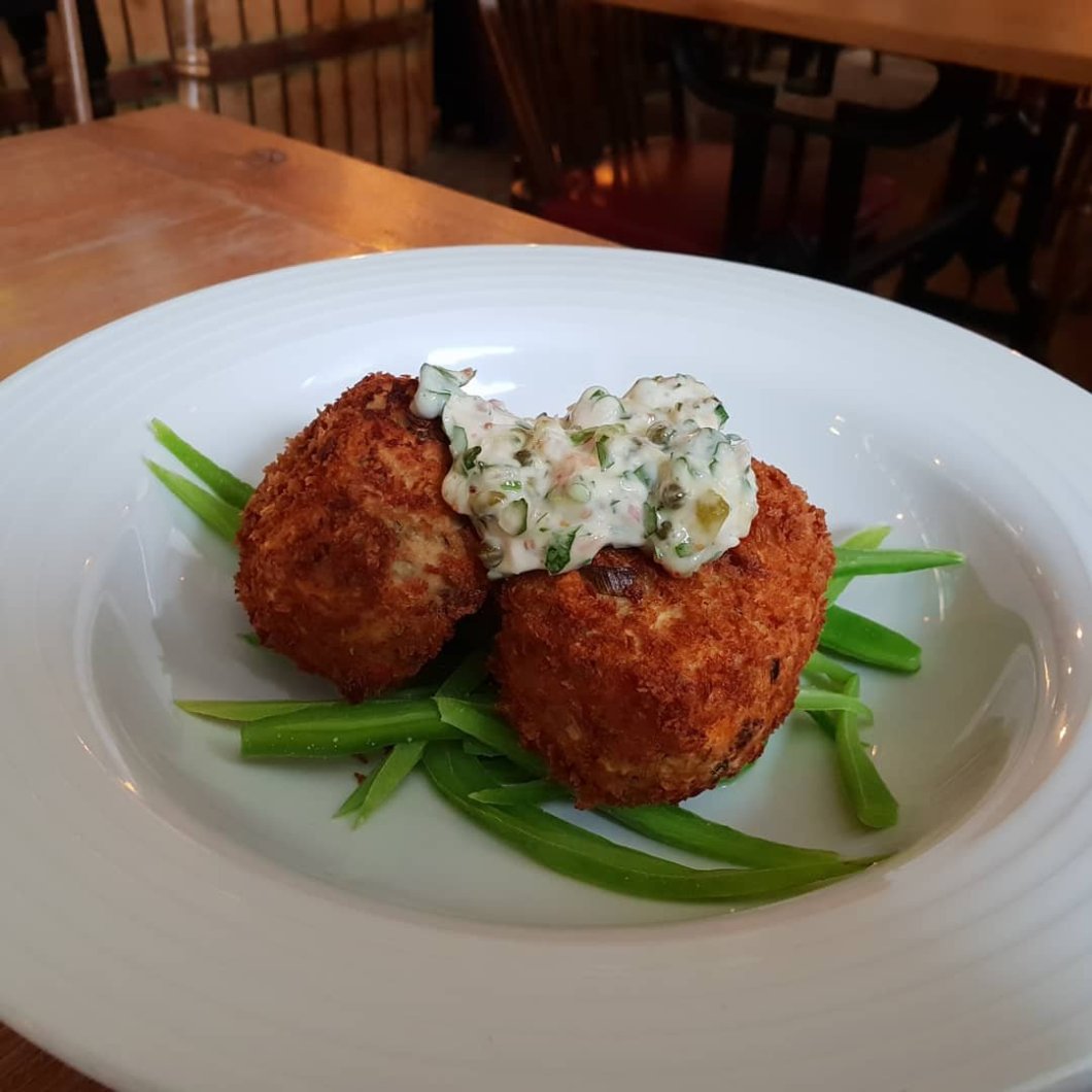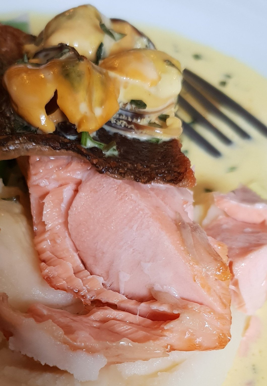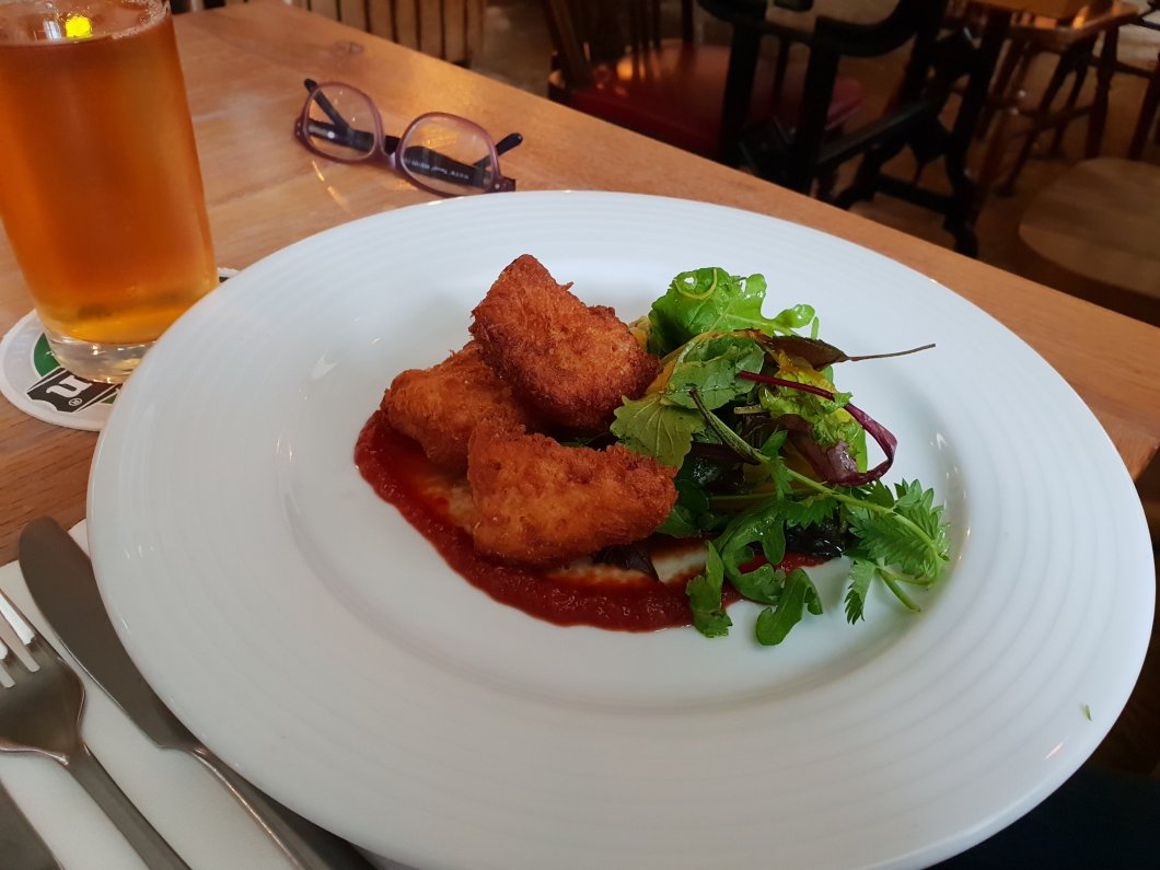 Lovely crispy (oil free) panko breadcrumb coating encased plentiful chunks of smoked (haddock) and unsmoked fish ( possibly sea trout and pollock looking at the menu) and a mustard seed infused mash.
