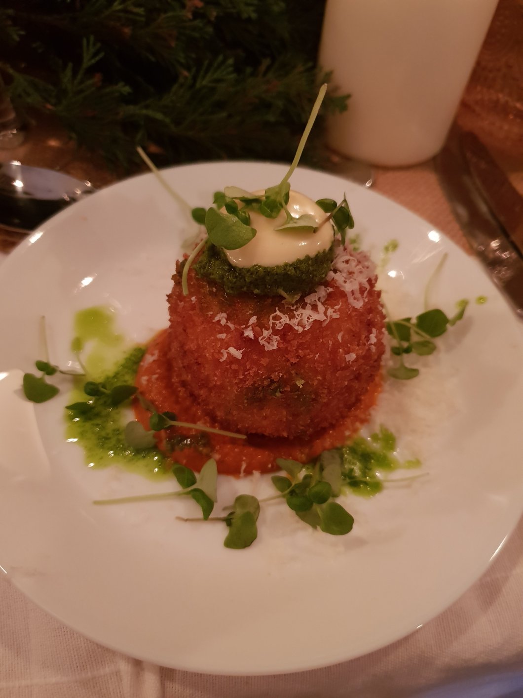 It sat on what I think was an Italian styled romesco sauce – a sort of toned down version of Crema di pepperocino (with more standard bell pepper than chilli in the mix). Atop the arancini it was a punchy gremalata and an aioli.