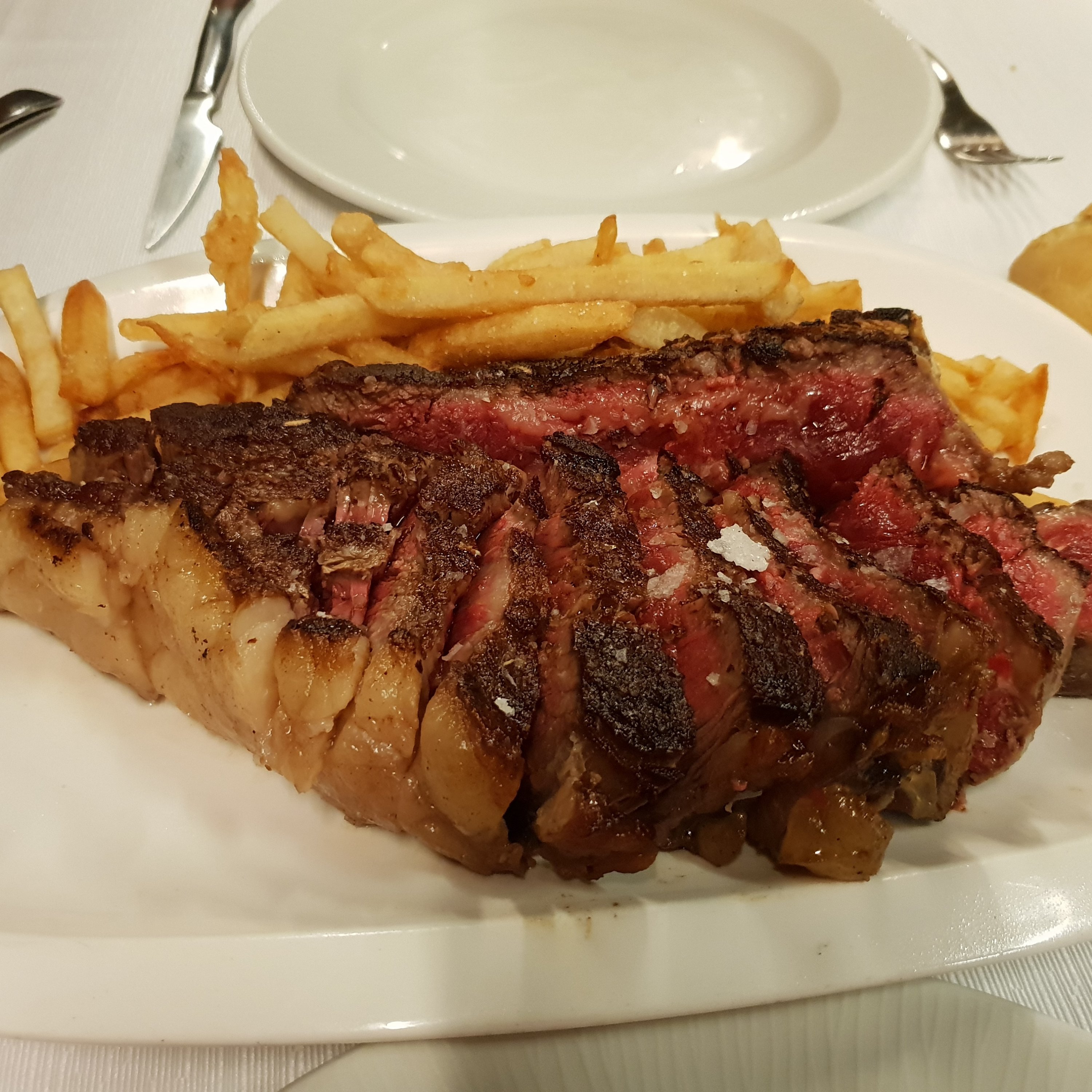 Great quality meat, full of flavour, cooked à point for me and very nicely priced at €39 a kilo. All a steak should be.