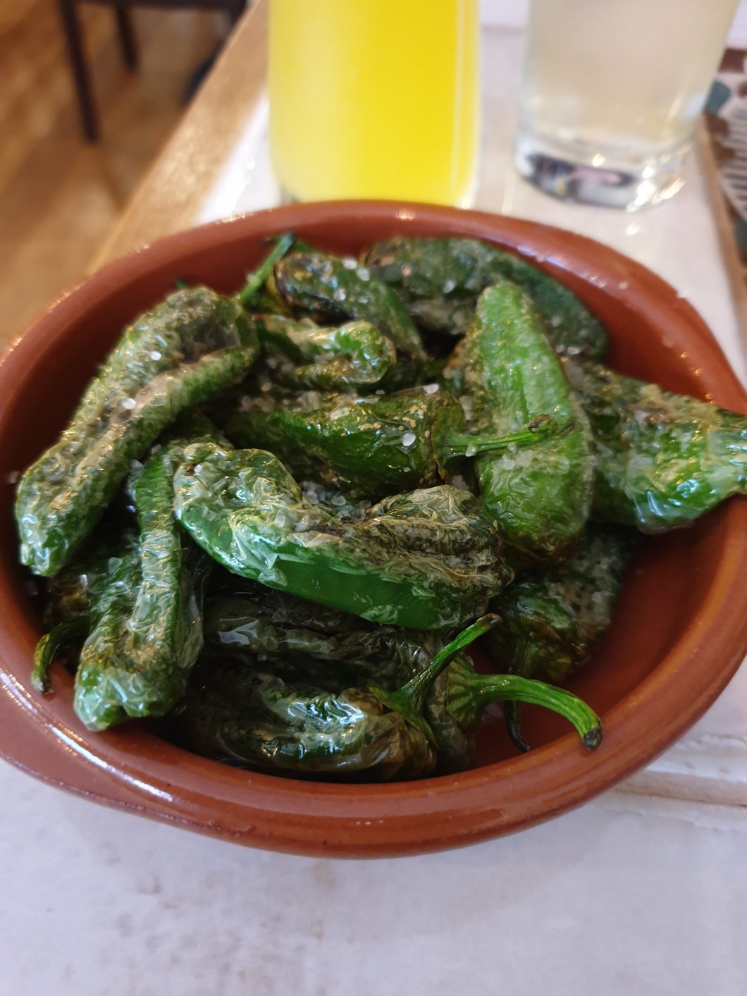 On a first look at the menu the first thing that drew my “lawyer/pedant” eye was the reference to Pimentos de Padron being translated into Gernika peppers. To the best of my knowledge Gernika (in Pais Vasco) peppers are different from Padron (in Galicia) peppers – not least by dint of being separated by about 600 kms. They are also not simply the same pepper grown in different places, but rather distinct strains of pepper. So it is odd that they seem to have confused the two. We asked which they were – Padron or Gernika – and were told they were Padron (so menu edit required).