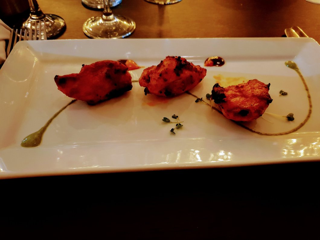 I was tempted by the Baga Beach Crab (love soft shell crab), but both Mrs. SF and I were drawn to the Kashmiri Chicken Tikka (£4.95).