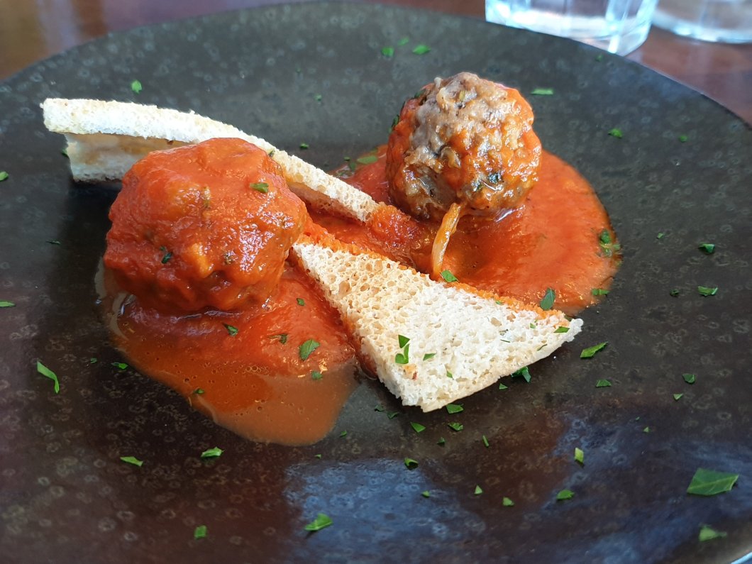 Whilst tempted by the mussels, I prefer them without cream and didn’t want to order a white and a red wine with our meal (school day the next day and all). I therefore plumped for, that Italian Nonna’s favourite, polpettes (meatballs). Here Welsh lamb, so a true Italsh/Wetlian dish.