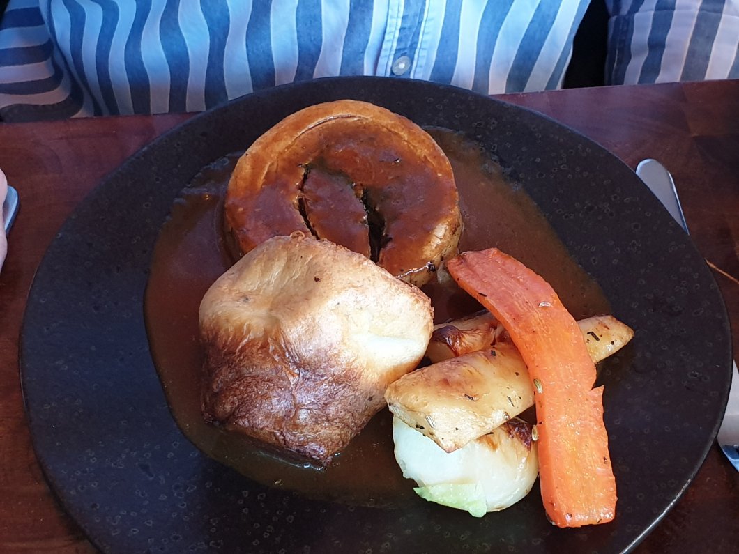and a carrot and a parsnip (both fine and properly seasoned). The yorkie was decent enough, with a good rise and a quite light texture, but I could have done with some extra gravy to pour into it (to be a proper yorkie it needs to have a good pour of gravy inside it it my opinion).