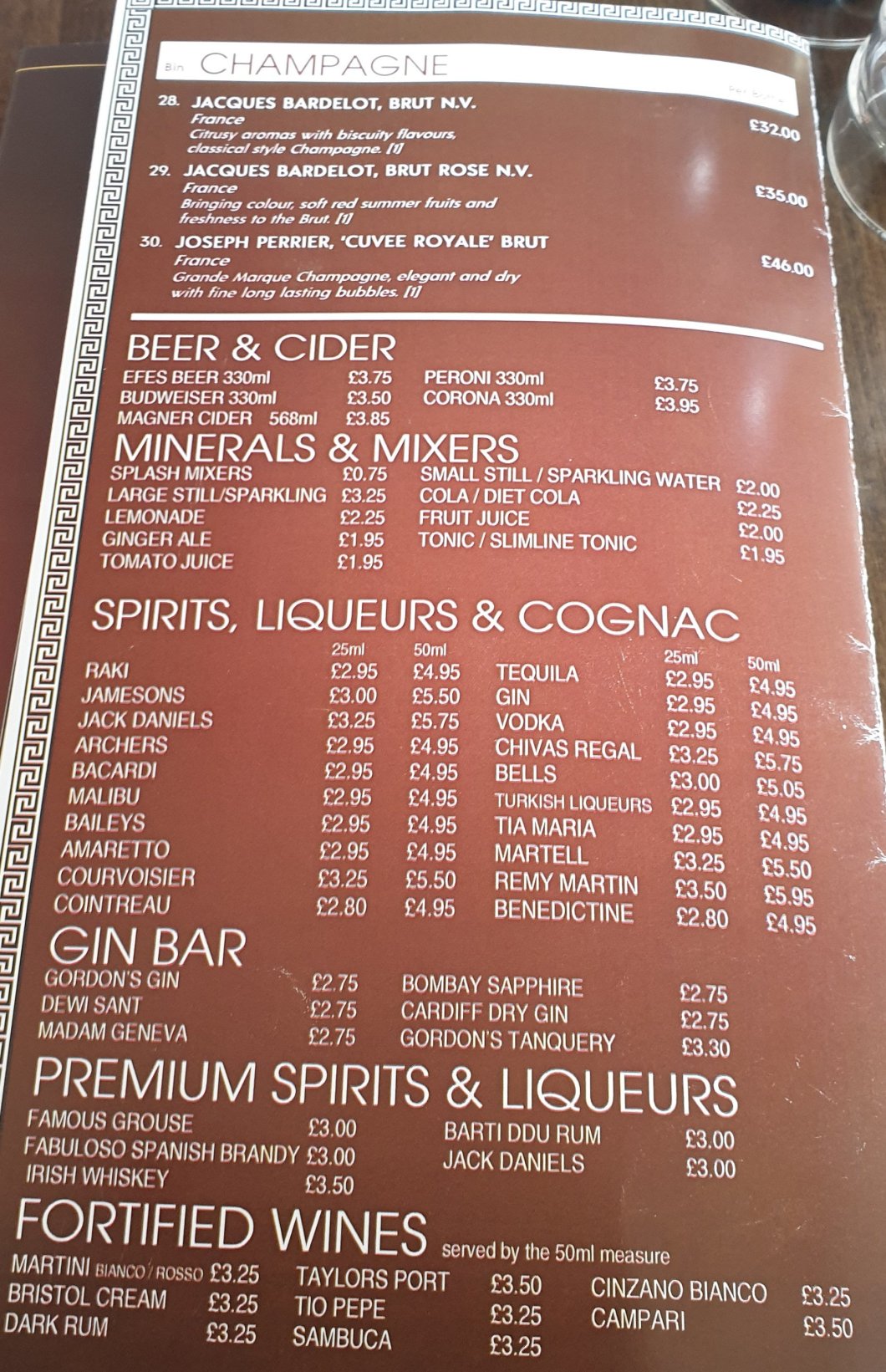 A couple of Sherries are on the menu (including the ever reliable Tio Pepe), but in a rage inducing (to me) 50ml format and at a very robust mark up (£3.25 for a 50cl glass – really why bother with a measure that barely wets a proper wine glass – equates to nigh on £50 a bottle for a wine you can get retail for well under a tenner, even in Waitrose). If they sell a single shot (as that is what a 50ml measure is) of the Tio Pepe, I will be amazed. Shame as sherries and Montilla Moriles Wines (the other place) work well with Turkish food.