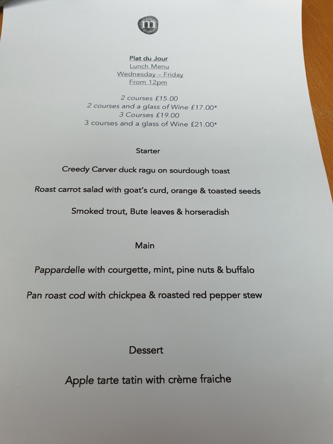The Plat du Jour menu is short and sweet with three starters, two mains and a solitary pudding.