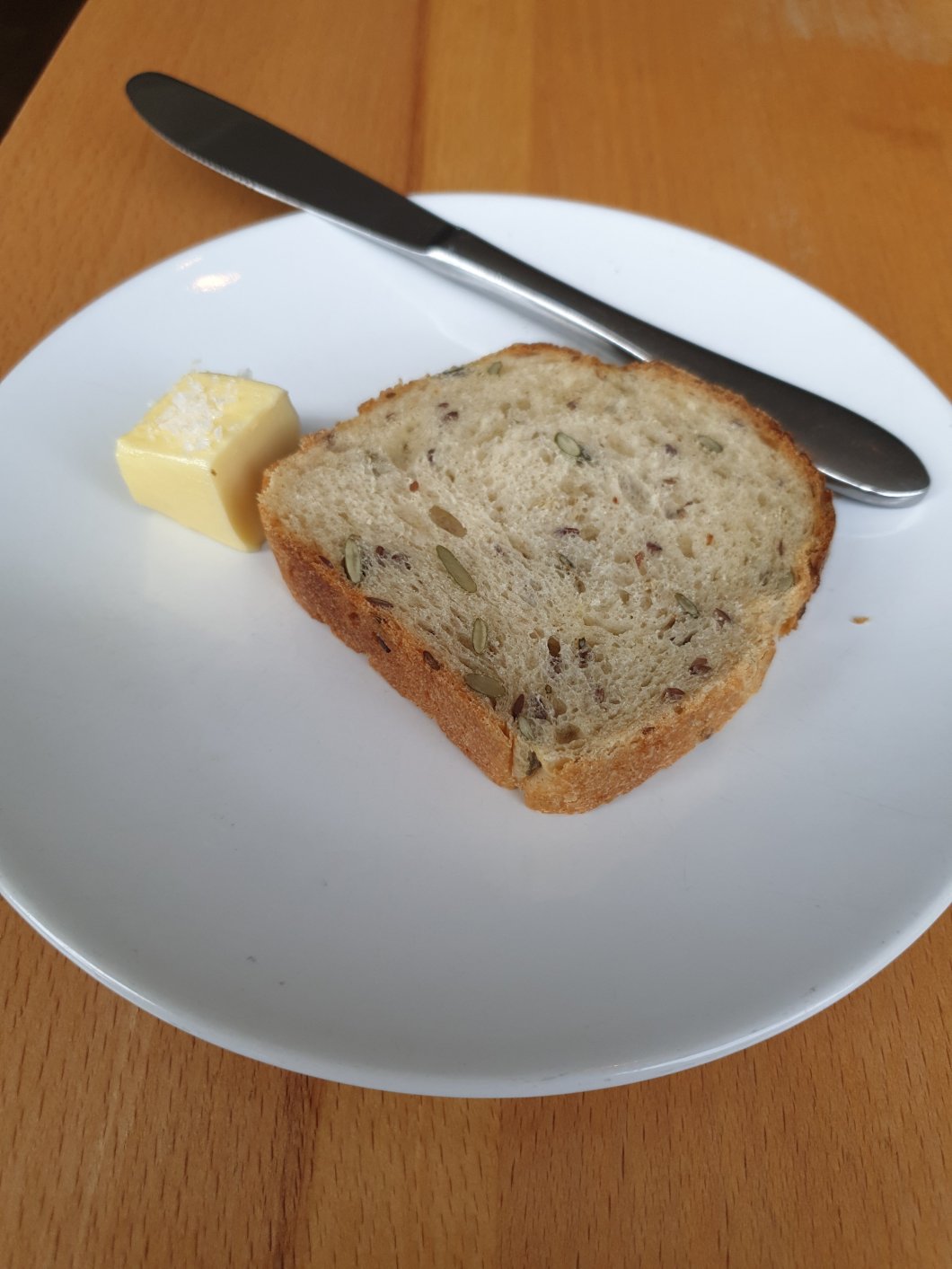 As I considered my choices (I was very torn, on the starter front, between the duck and the trout), a rather nice slice of, caraway seed studded, bread and generously salted butter was placed on the table.