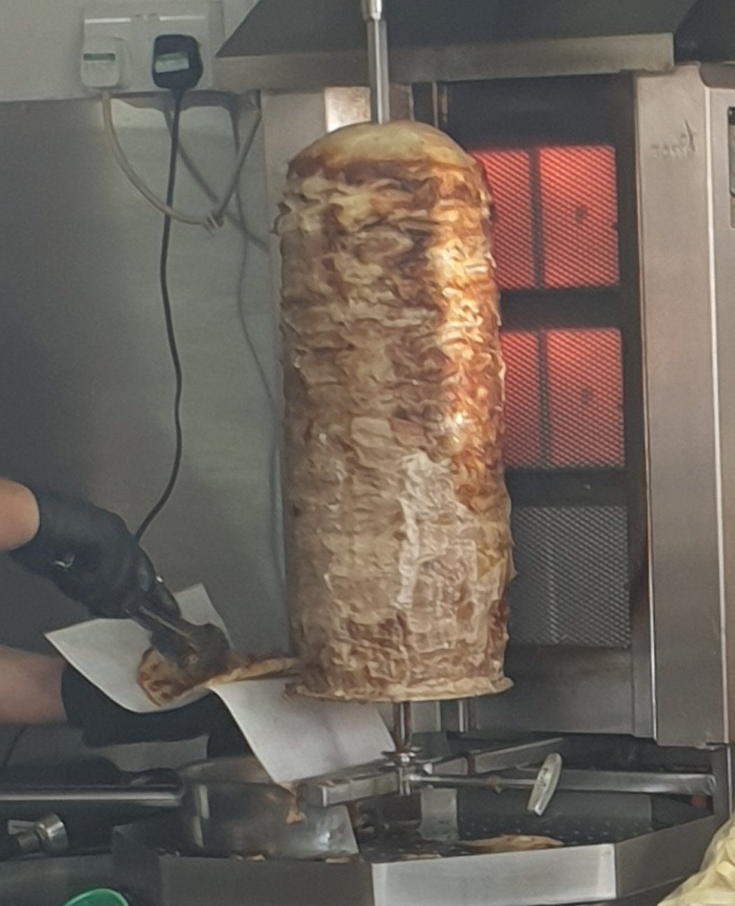 So my pronunciation is good, how about the gyro itself – here as a wonderful combo of sliced grilled meat (cooked on a vertical rotisserie), stuffed with