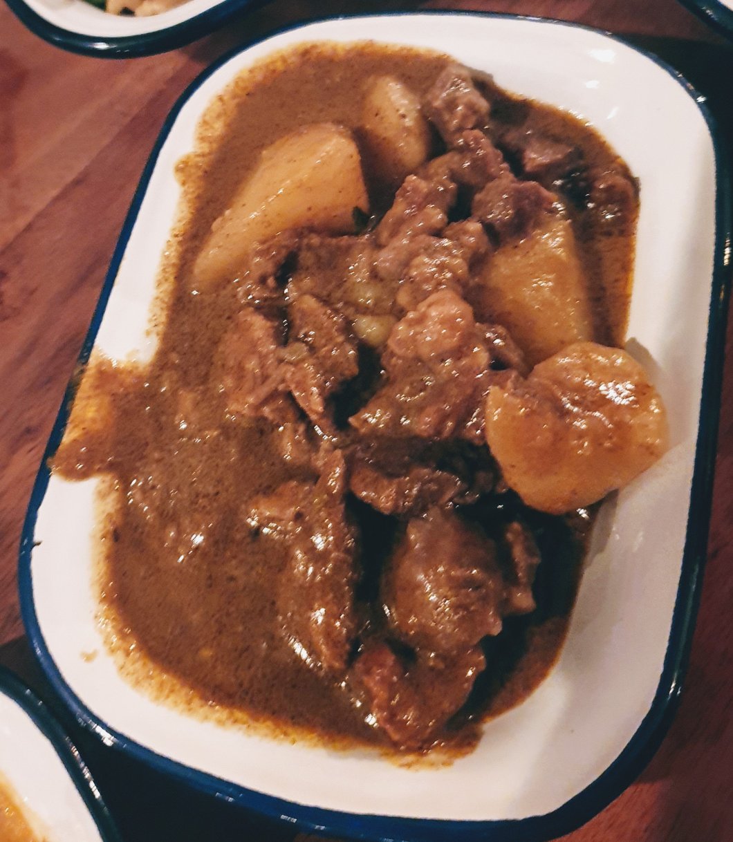 Notwithstanding this the chicken was tender and plentiful and the shredded roti added bulk and texture to the equation (making it a nice alternative to rice or spuds with meat – a sort of “special fried bread”). Good as a side to a meat dish, I thought (a bit like the pineapple curry) it would have been a bit wanting if ordered on its own or as the centre piece meat dish.